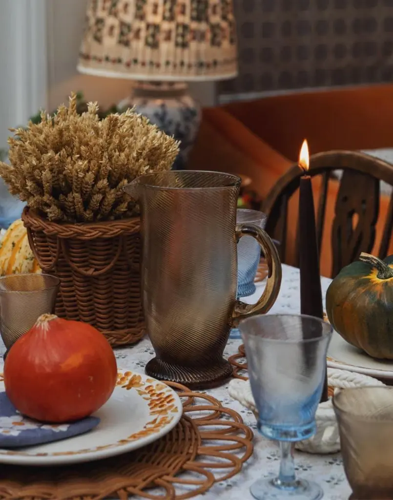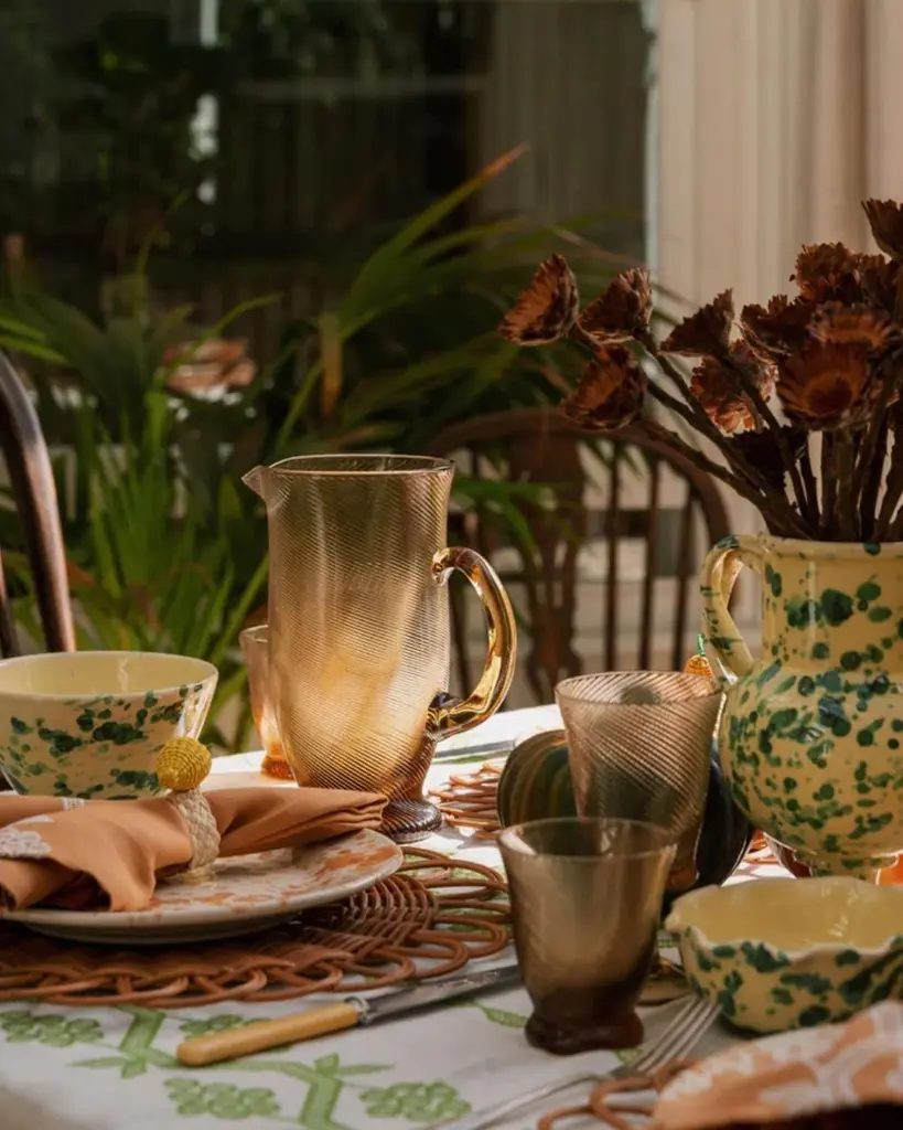 An elegant statement pitcher for the table, our Spiral water jug is mouth blown by talented artisans and comes in three colourways: Pink, Light Blue and Chestnut brown. Also available, matching tumblers and wine glasses.