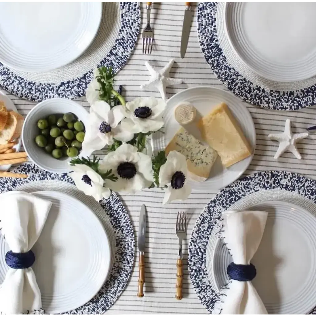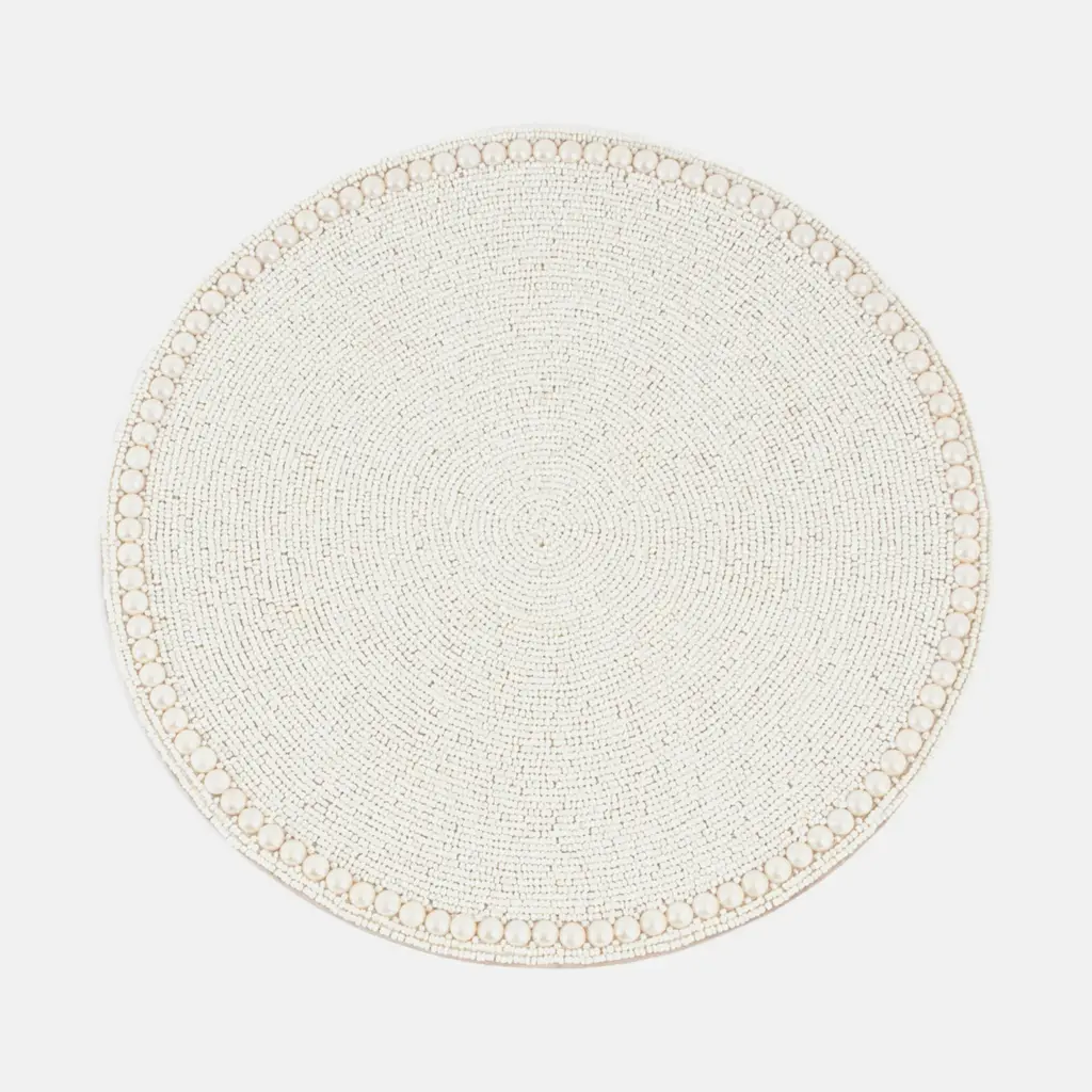 These eye-catching placemats stand out thanks to the chic mix of colorful beads and white. The strong silhouette and festive look make them an instant classic and a versatile piece that instantly dresses up a table. Available in red, black, bronze, & navy.