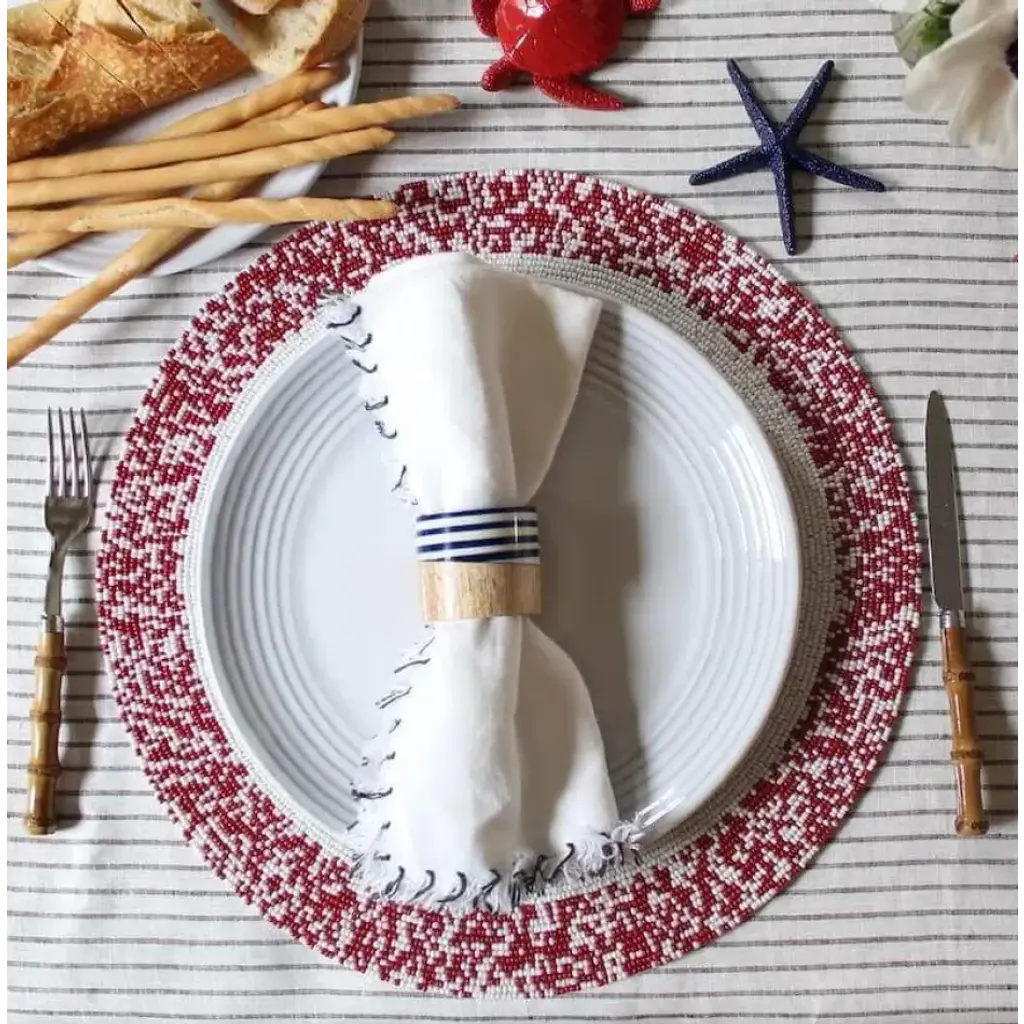 These eye-catching placemats stand out thanks to the chic mix of colorful beads and white. The strong silhouette and festive look make them an instant classic and a versatile piece that instantly dresses up a table. Available in red, black, bronze, & navy.