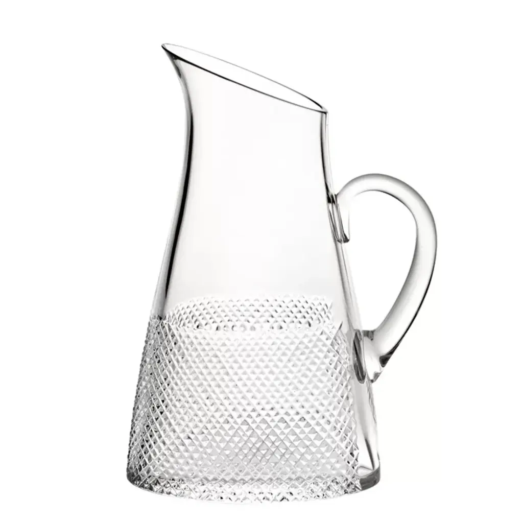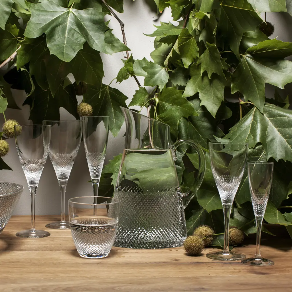 Boasting a lustrous, eye-catching finish, the design exudes both simplicity and sophistication. Minute spikes on the crystal surface radiate the material’s inherent grandeur in a mesmerizing way. This set takes a fresh approach to the traditional diamond-cut style. Its understated yet refined appearance allows for seamless integration with various table settings, adding a touch of elegance to any gathering.