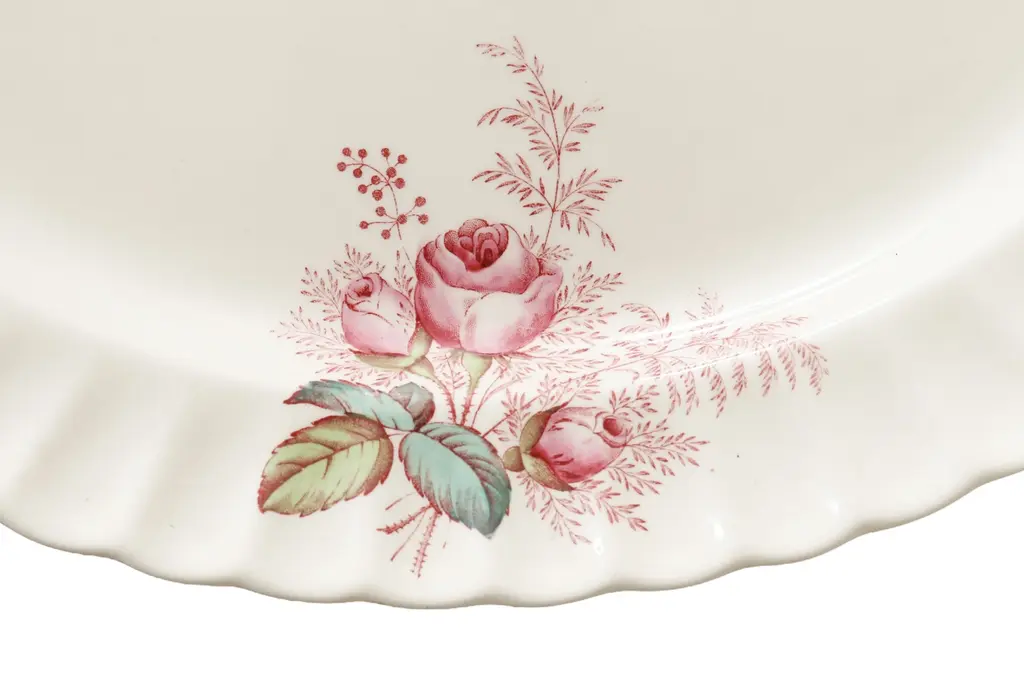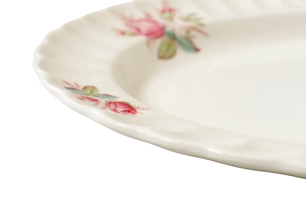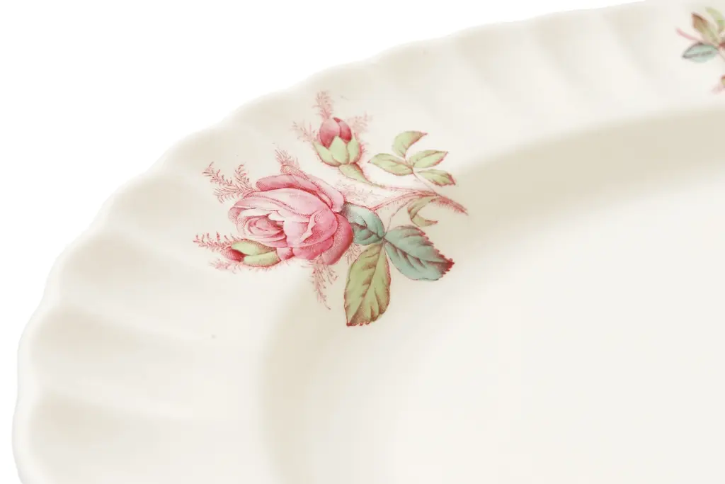 A white oval transferware ceramic platter made by Spode, in their Dubarry pattern, produced from 1946 to 1964. The platter is decorated with pink roses on a scalloped edge, with a larger floral spray at the center bottom. Marked underneath “S.2391, Copeland, Spode, Dubarry”.