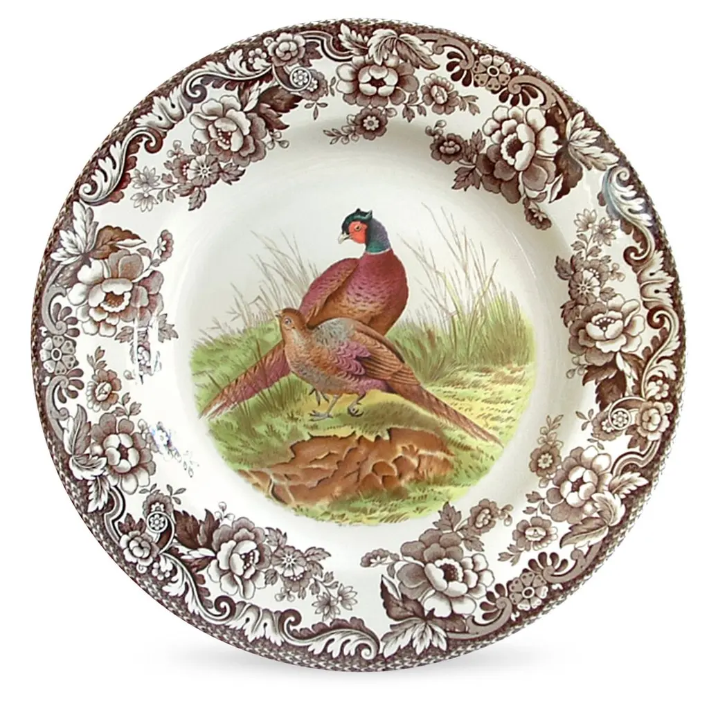 Embellished with a floral border, this impressively decorated porcelain bowl features a bucolic scene punctuated by two wild pheasants. This dish can conveniently go from microwave to table to dishwasher with ease. Made in England.