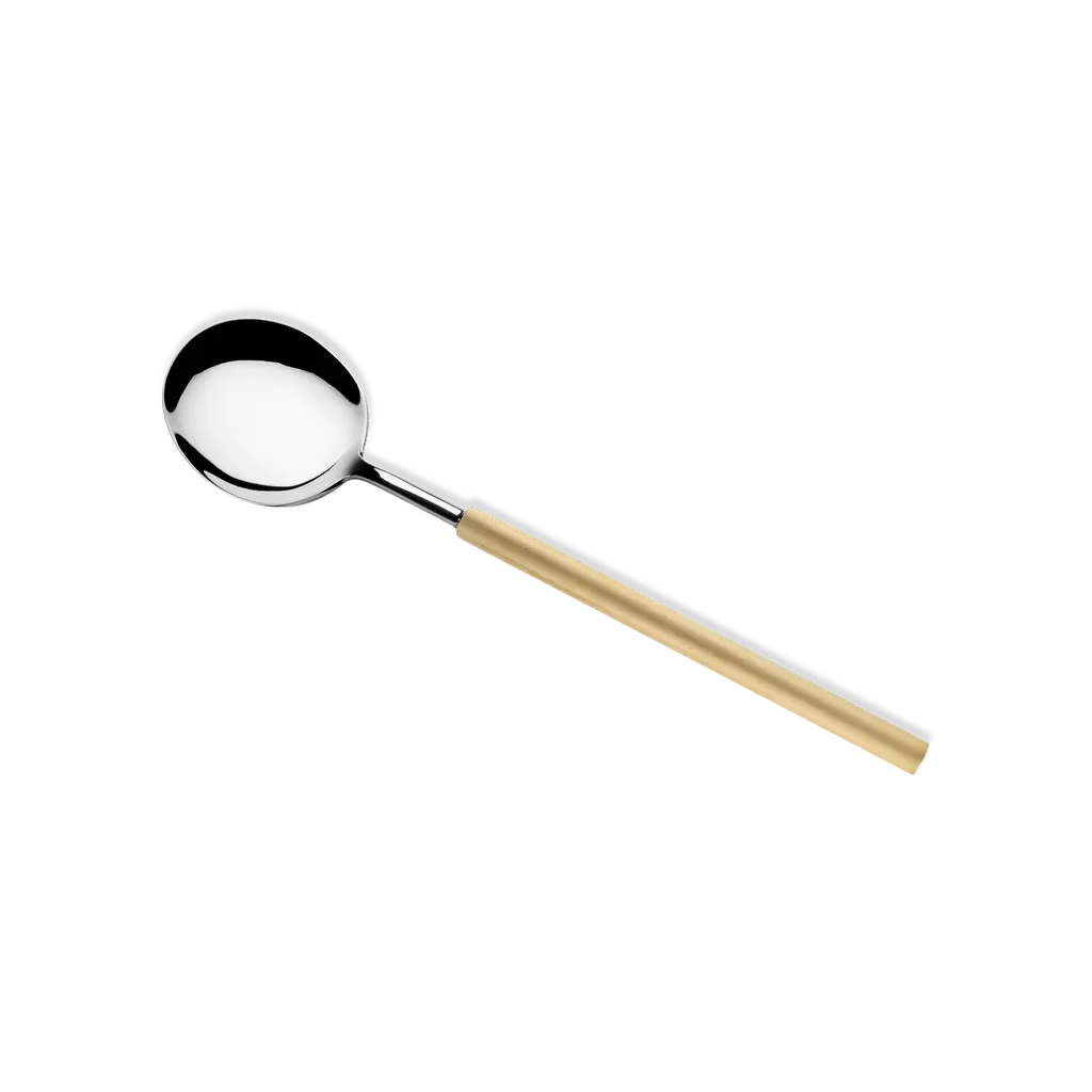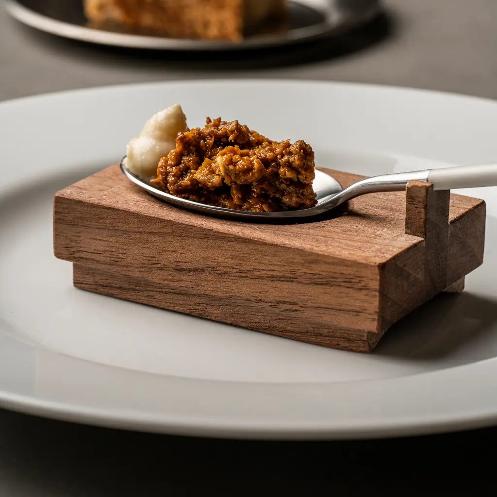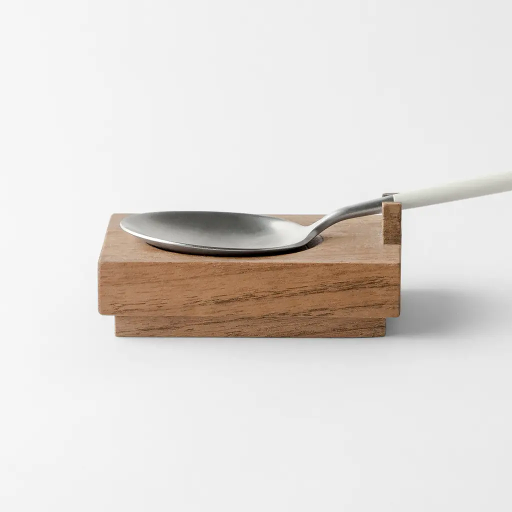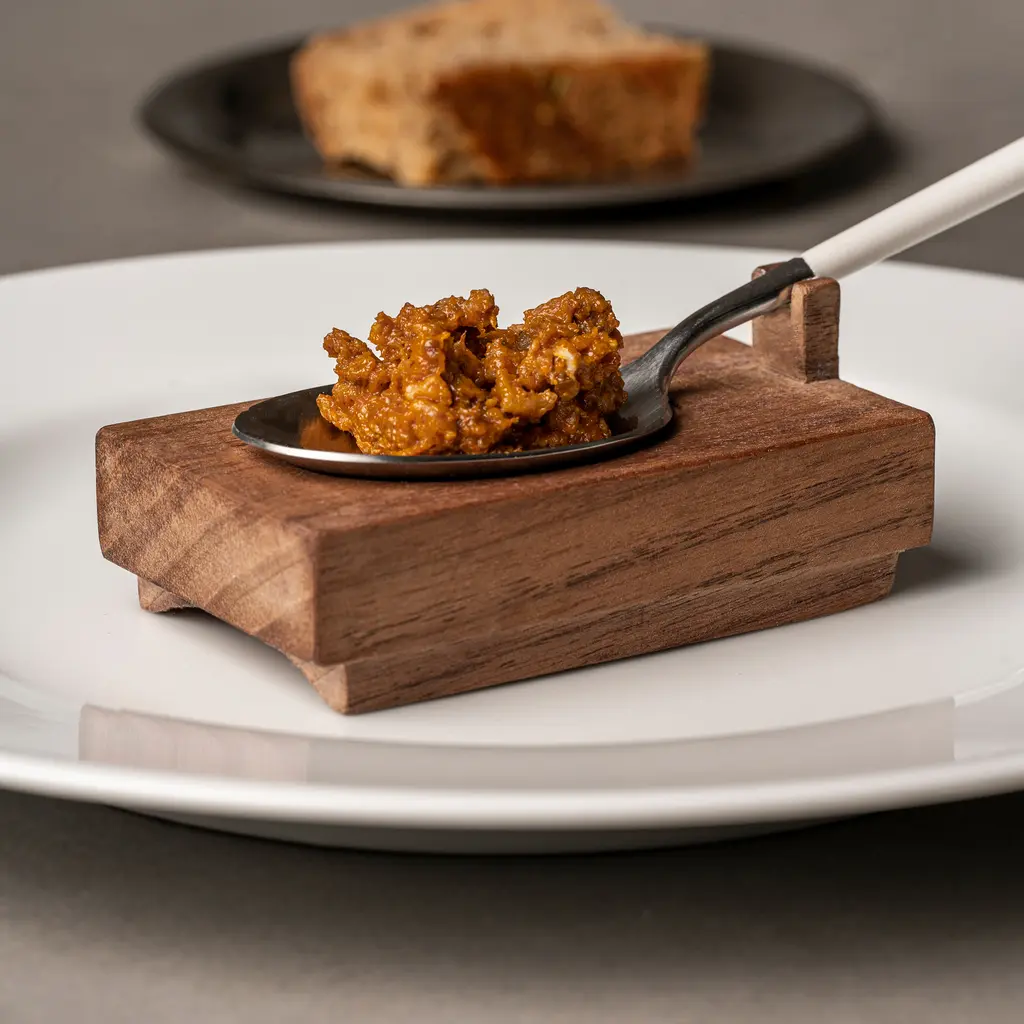 Serving spoon with stand—a stainless-steel spoon nests in a solid wood block to deliver a single bite, sauce, or garnish cleanly to the table. Made in Italy by knIndustrie, it turns a familiar tool into a tiny plate. The block has a shallow dish to cradle the spoon bowl and a notch that parks the handle, so the piece arrives steady and goes back down without drips. Wood brings warmth; the spoon’s polished metal keeps flavors neutral and wipes spotless between courses. Set one at each place or line up a few on a board for pass-around tastings. Use it for amuses, chutneys beside grilled meats, a spoon of granita, or a dollop of jam by the cheese—small, precise, and ready for service.