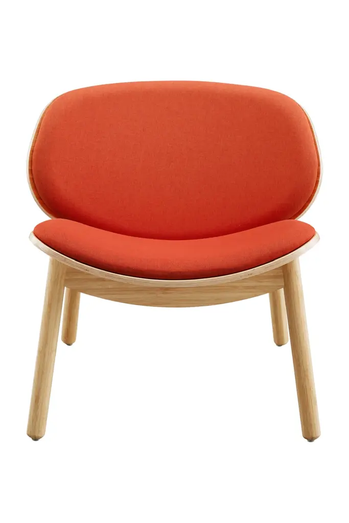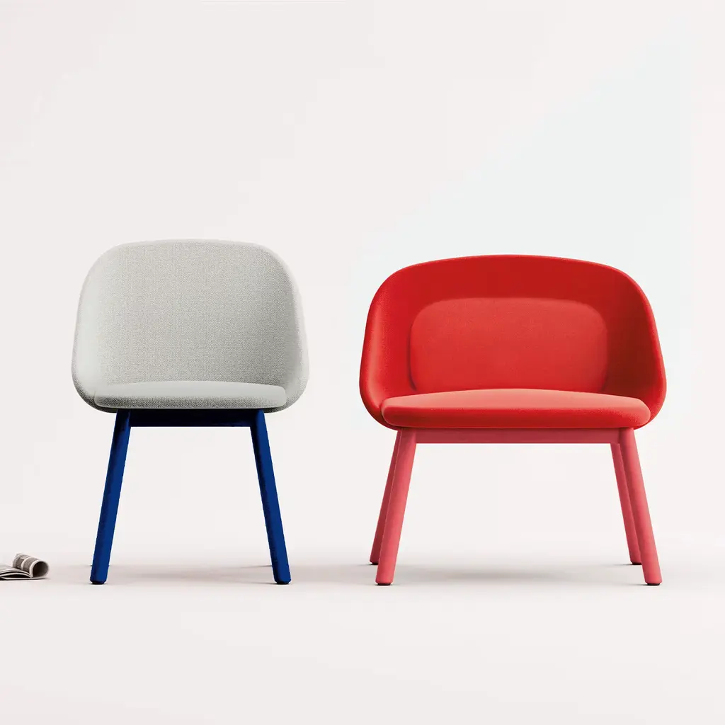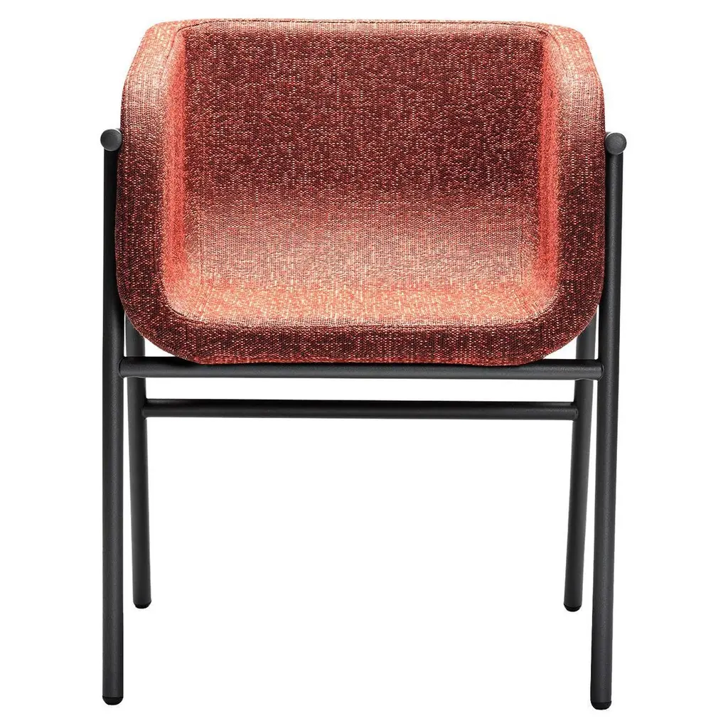 Conceived as an embrace between an enveloping shell and a plush seat inspired by ancient prosperity symbols, this armchair combines great comfort potential with a strikingly glamorous personality. A vivid pink tone (RAL 3020) is the one selected for the solid beech's stain, the hue standing in harmonious contrast with the red of the seat's fabric upholstery (ref. Luna 307).