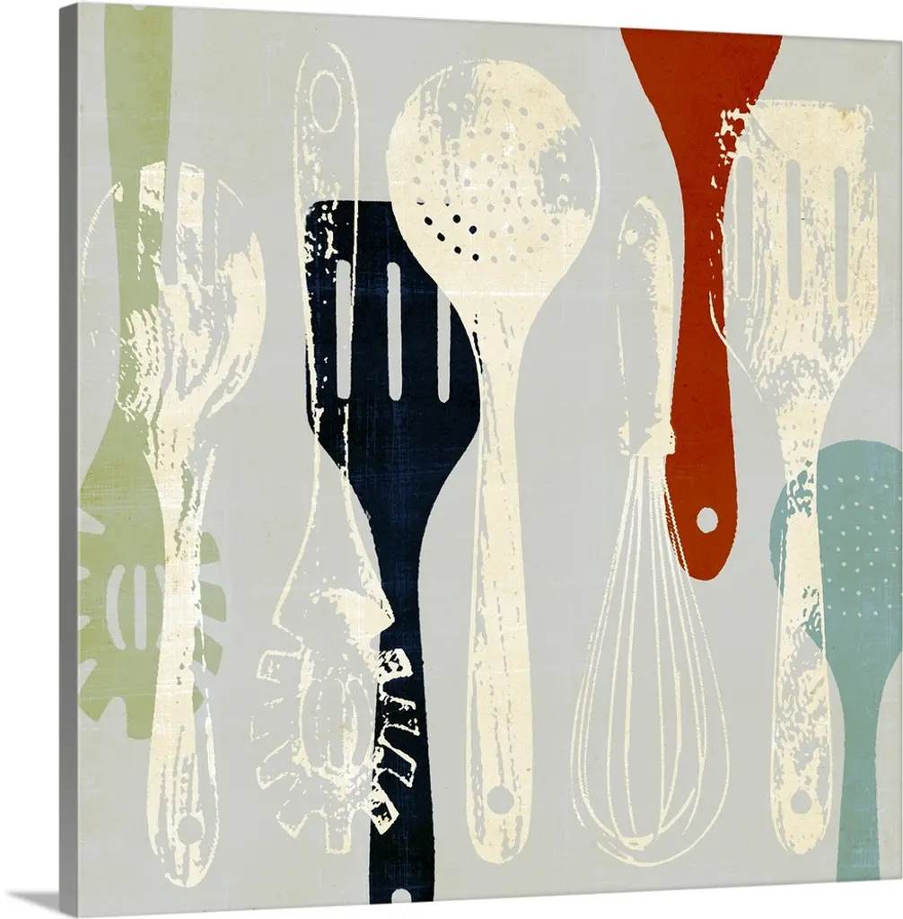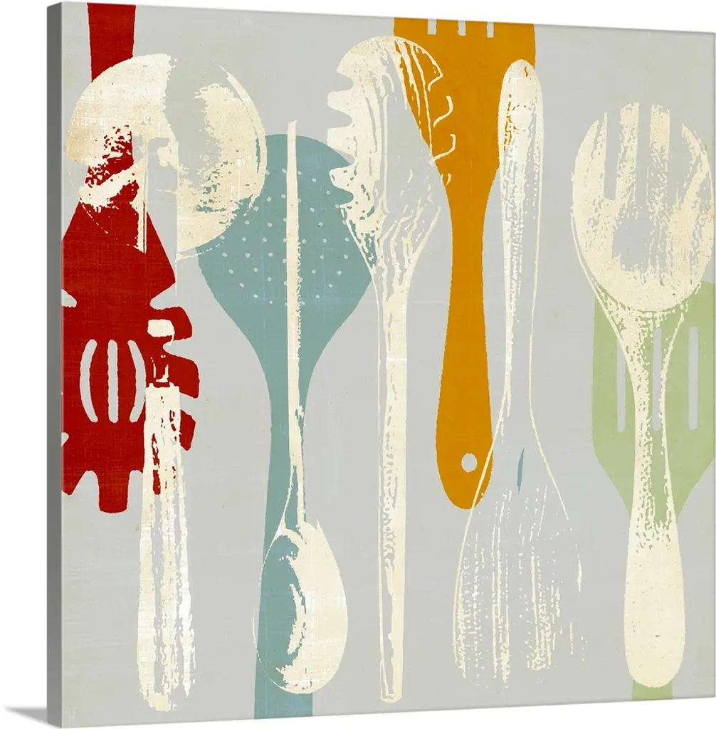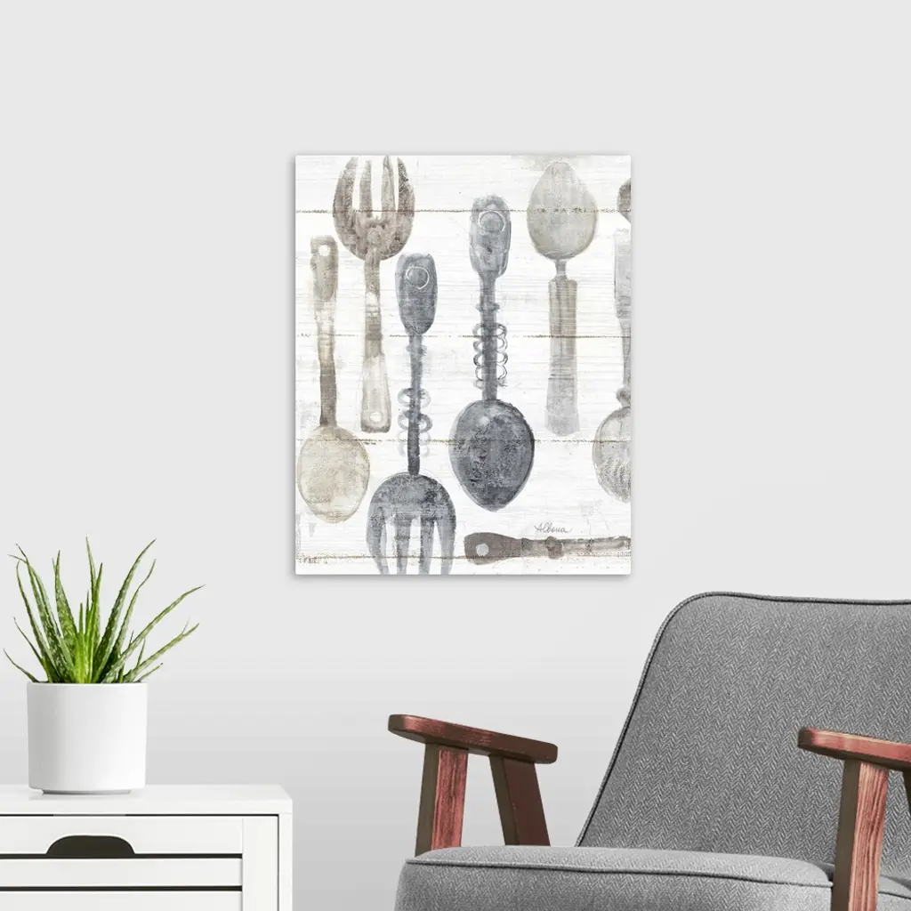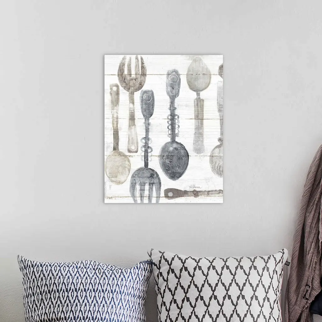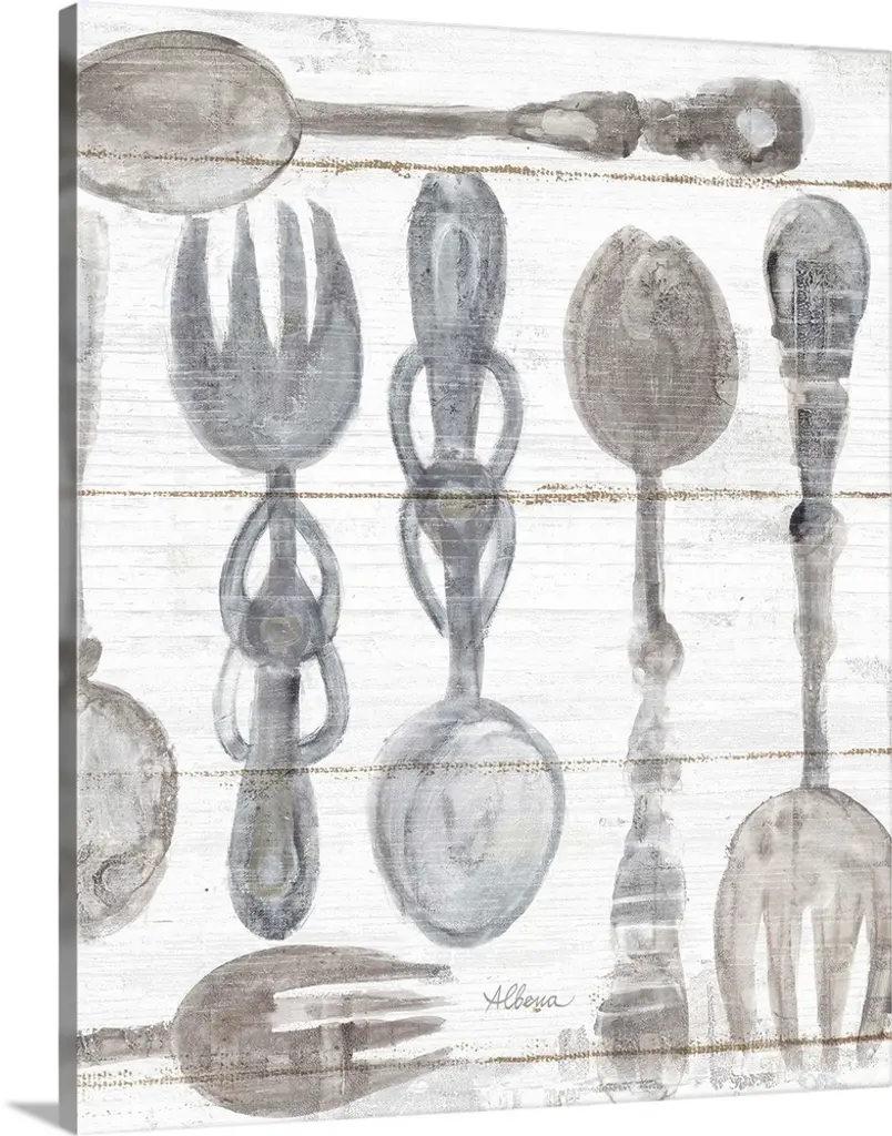 Decorative artwork featuring watercolor cutlery against white shiplap.