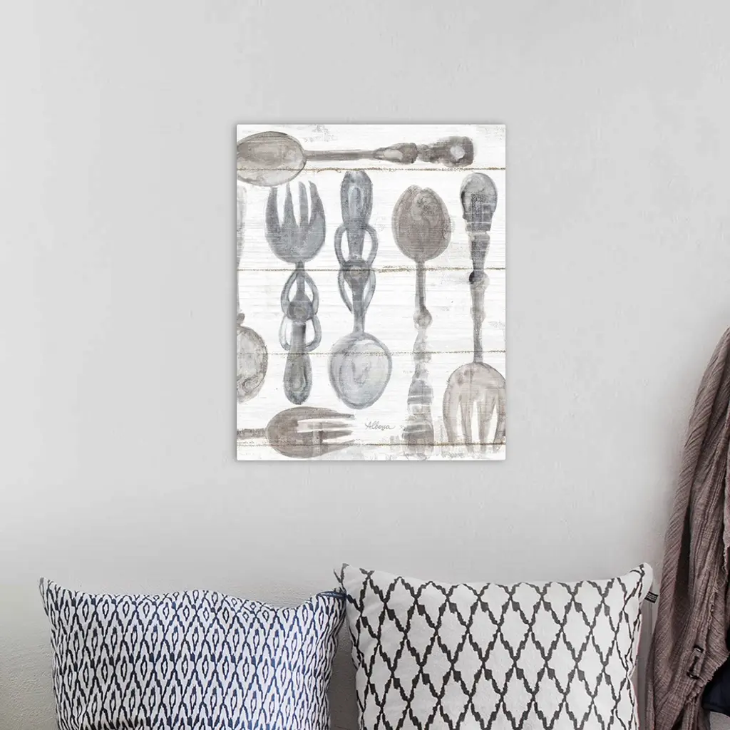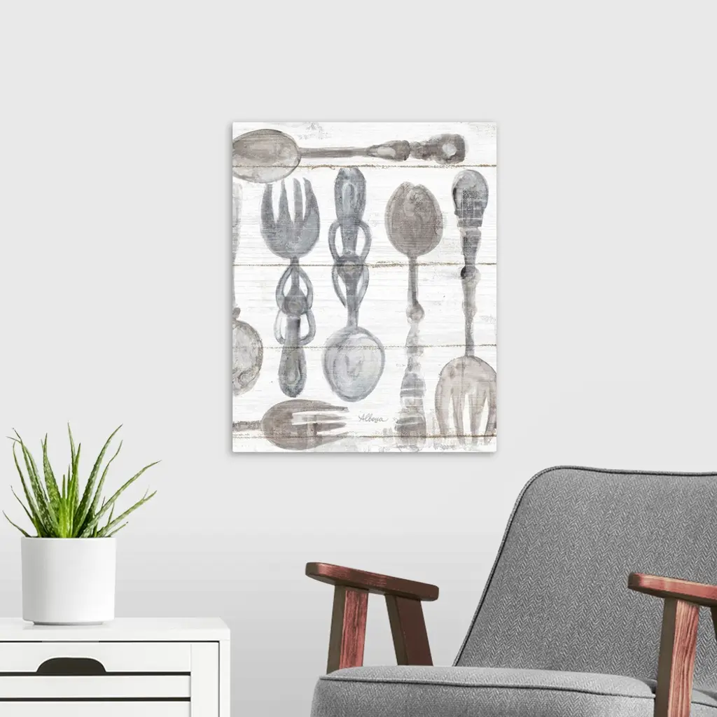 Decorative artwork featuring watercolor cutlery against white shiplap.