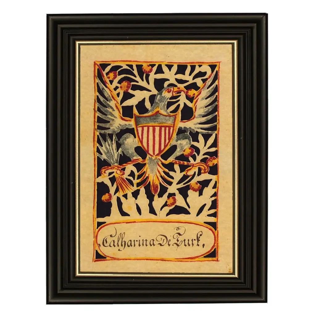 Lacy 18th C. cutwork were cut freehand with scissors from strong rag paper. Our authentic-looking Spreadwing Eagle with Shield Breastplate reproduction scherenschnitte paper cutting is laser cut, colored, and then placed against black paper stock. Framed behind two layers of glass for added depth, in a black and gold wood frame. The back is covered in craft paper and includes a saw tooth hanger. Quality materials and hand craftsmanship....entirely from the USA! The German enscription reads "Catherina De Turk." The perfect addition to historical or Americana decor. - Framed to 8-3/4" x 12" - Frame width: 2" - Frame thickness: 3/4" - German enscription reads "Catherina De Turk" - Laser-cut scherenschnitte - Behind two layers of glass for added depth - Antiqued paper