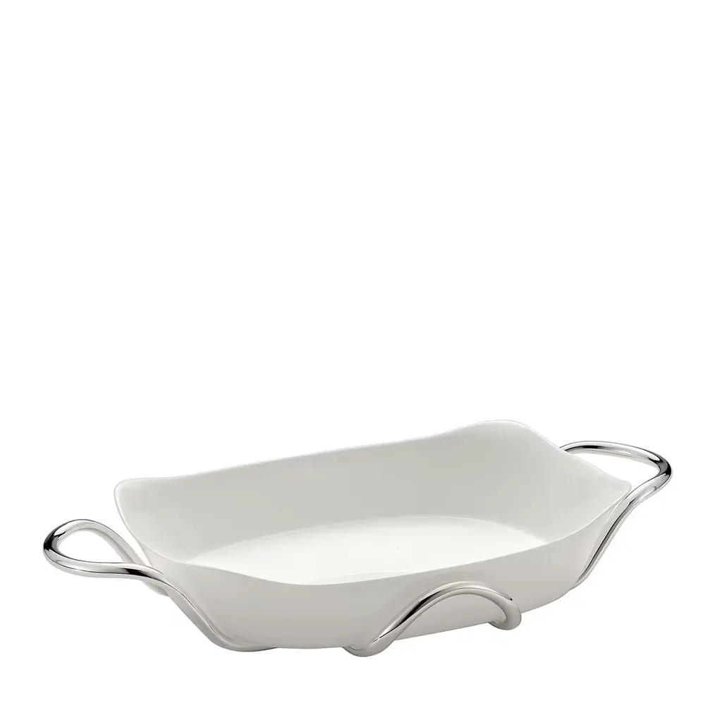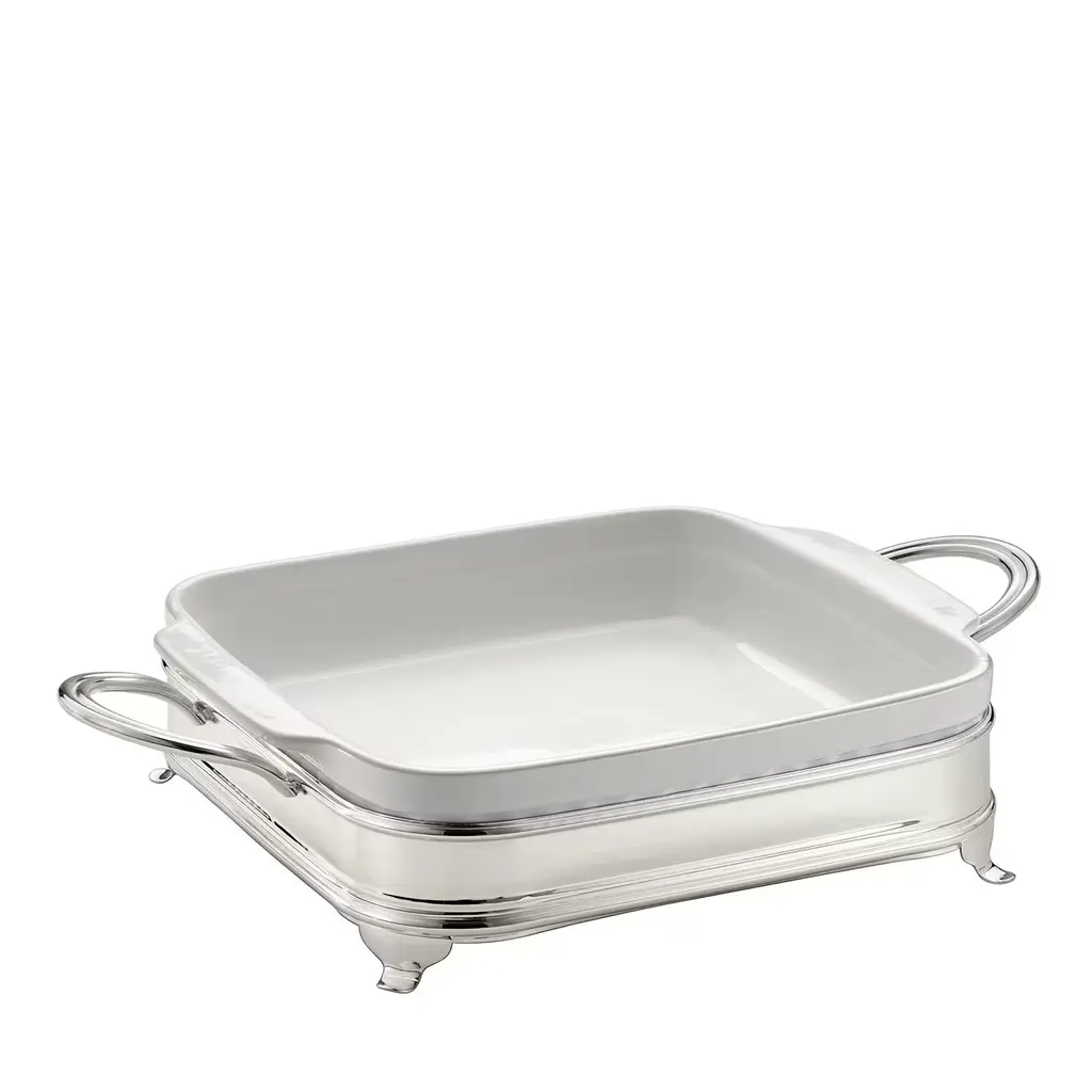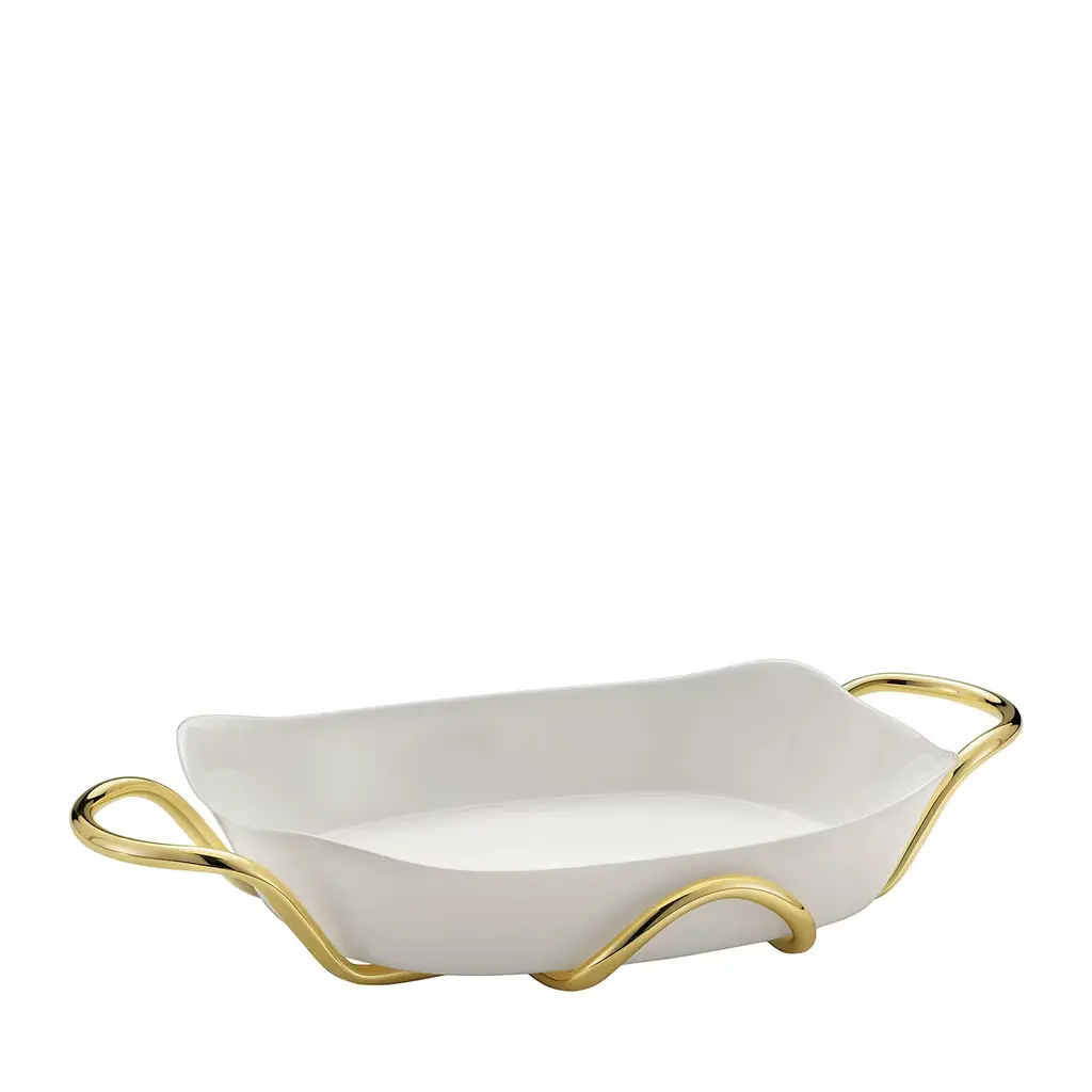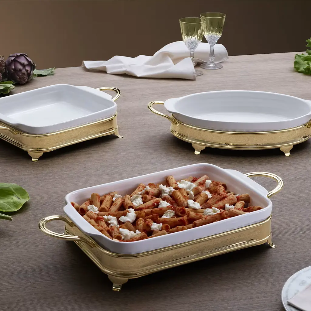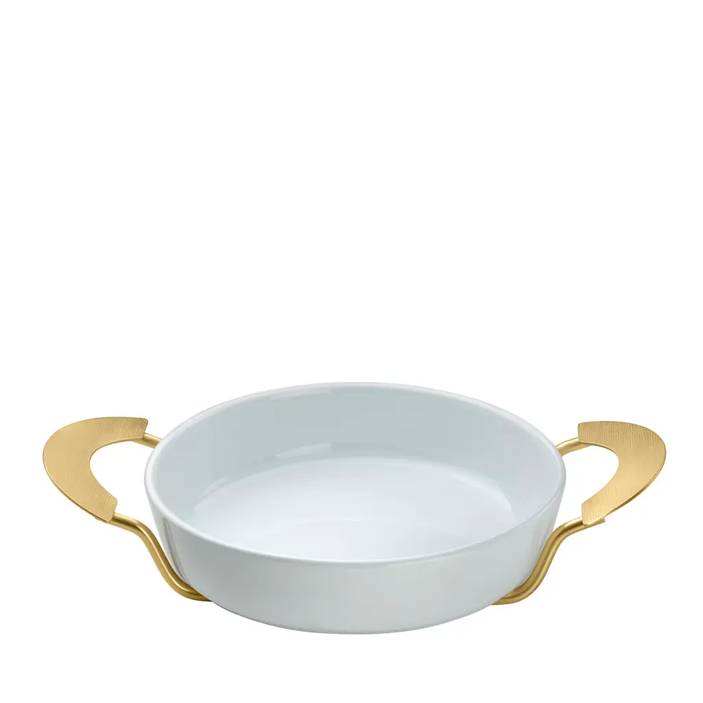 This superb set comprised of a white ceramic baking dish and its holder was designed for serving hot food without compromising on refinement or luxury. Fashioned of brass and offered in a gleaming golden finish, the holder features two practical handles and four tiny feet that avoid direct contact with the table. Oval and rectangular counterparts are available in the Artemest catalog.