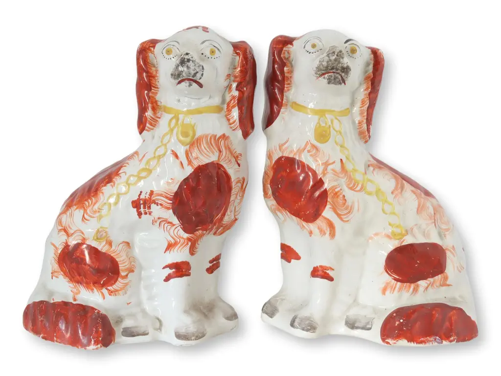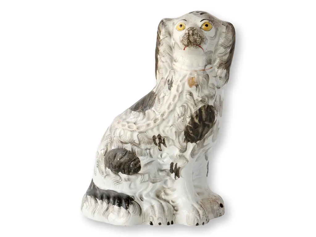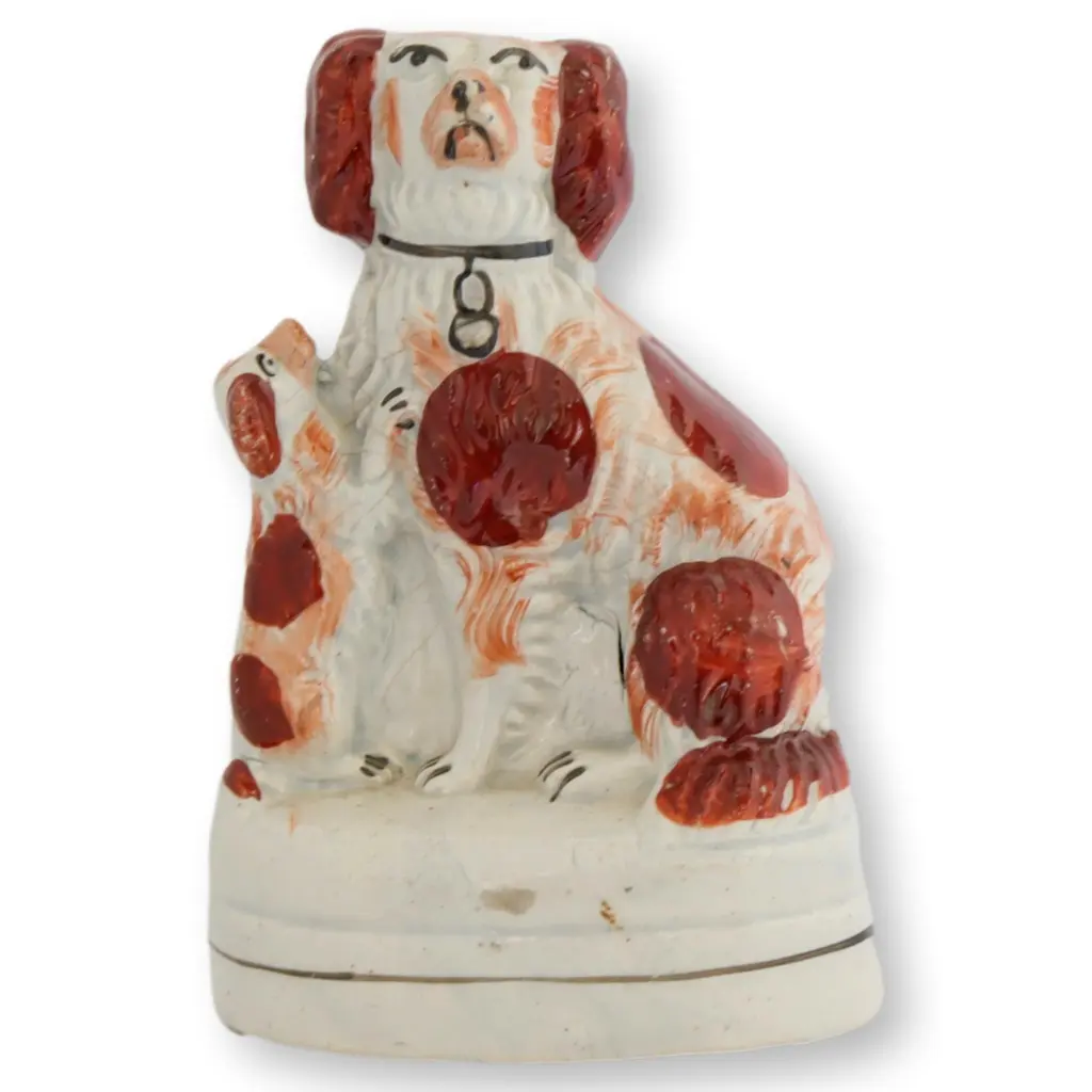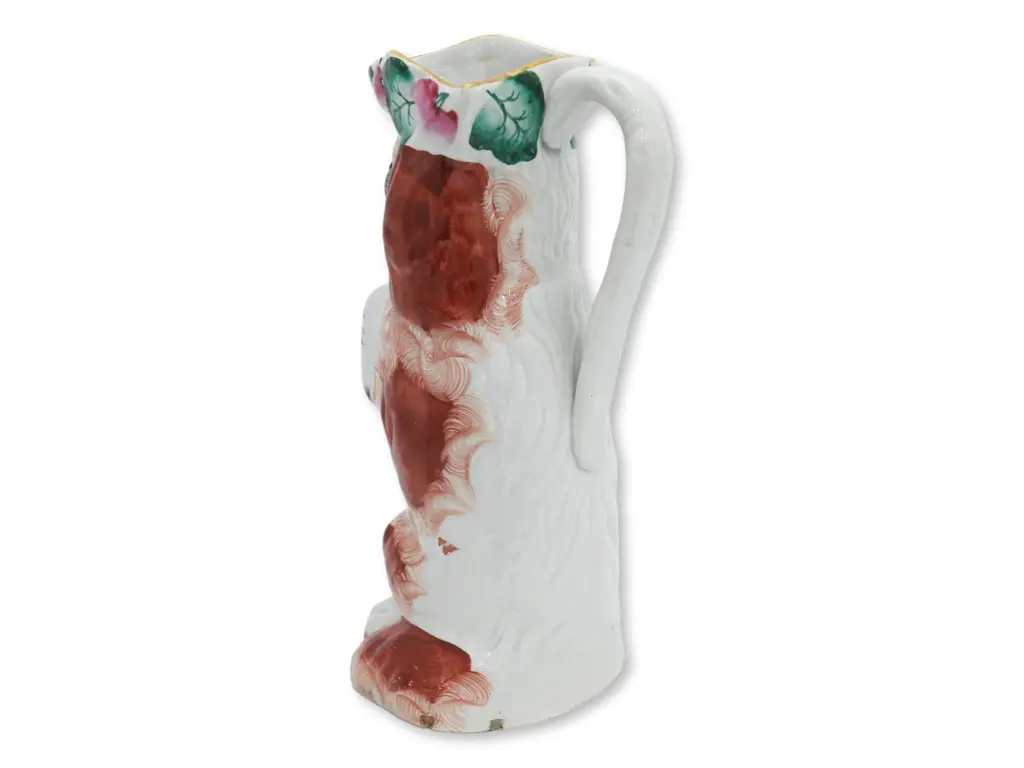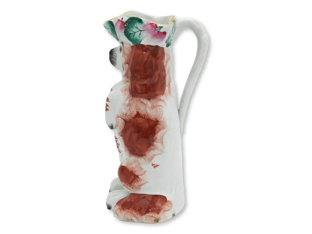 Antique Staffordshire begging King Charles Spaniel jug, circa 1850. Highly collectible and often reproduced, Staffordshire dogs were modeled after Queen Victoria's beloved King Charles, Dash. No maker's mark. Light wear, minor flakes/flaws, crazing.