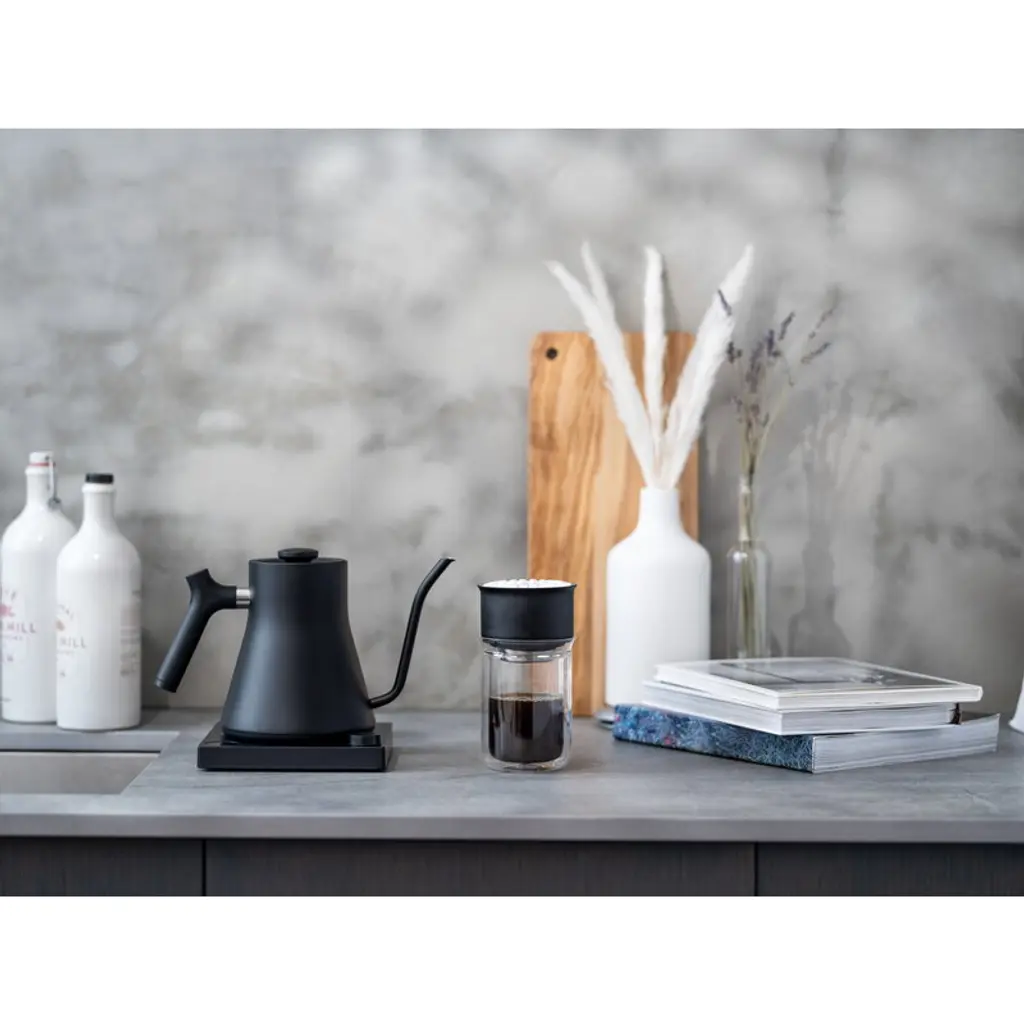The Fellow Stagg coffee set contains the necessary tools for a delicious cup of pour-over coffee: in addition to the Stagg X dripper, the set also includes a tasting glass, for immediately enjoying your freshly brewed cup of Joe, as well as 30 paper filters. The Stagg X set is designed to make the pour-over technique as effortless as possible. The steep walls of the dripper and the unique hole pattern in the bottom ensure optimal flow and prevent clogging, while the double walls guarantee a consistent temperature. The dripper comes with a stainless steel cup that has a double function as a ratio aid and a drip-catcher. The set allows you to brew 10.14 fl oz (300 ml) of coffee at a time; so in effect one cup. The set also includes a practical silicone lid for the glass to keep your coffee hot for longer, if you like to sip and enjoy it at your own pace.