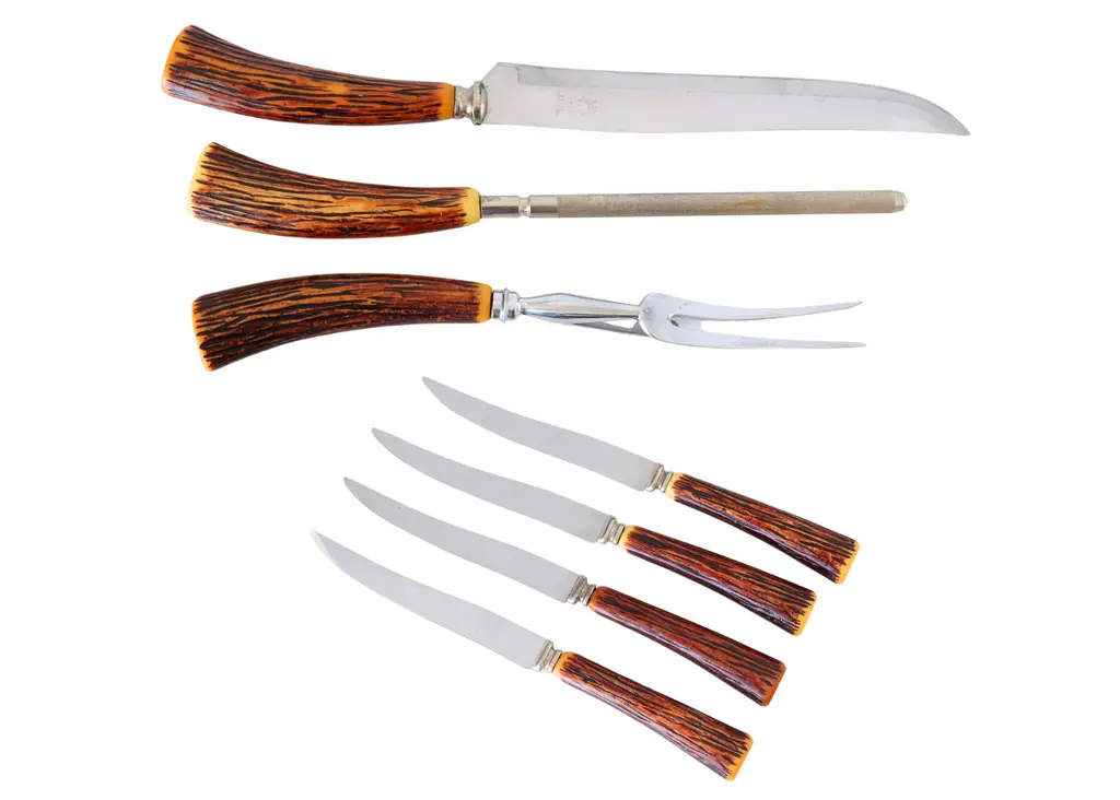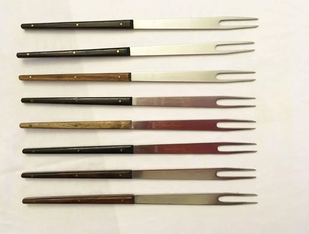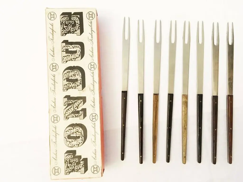 Two sets each four pieces.Stainless hardwood fondue forks by Amboss Austria designed by Carl Auböck in 1959.Very good original condition.