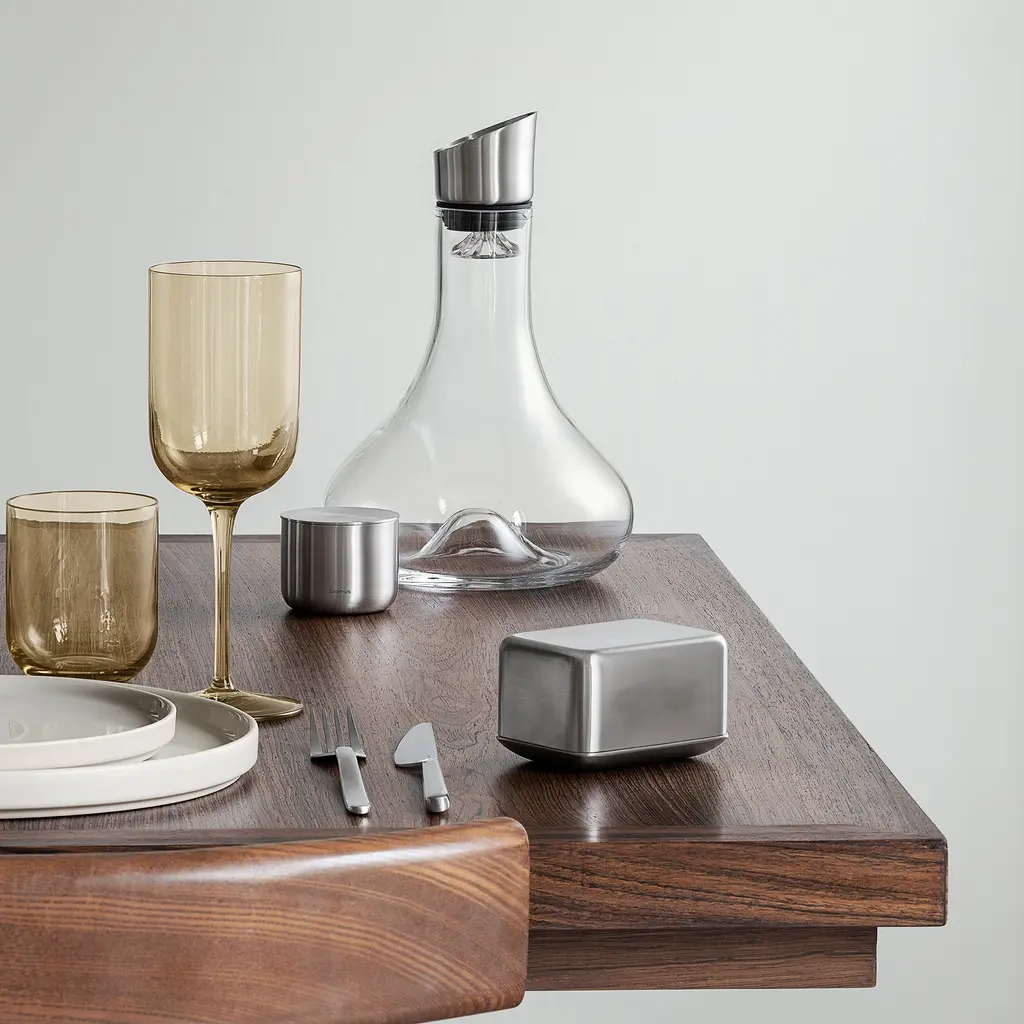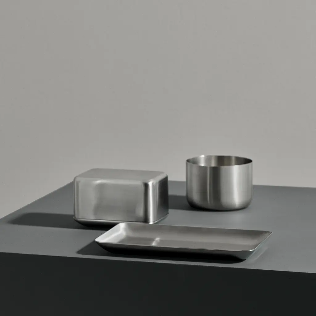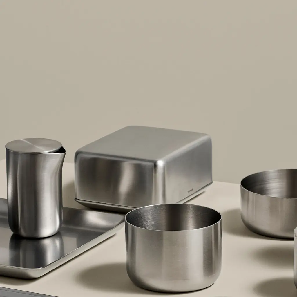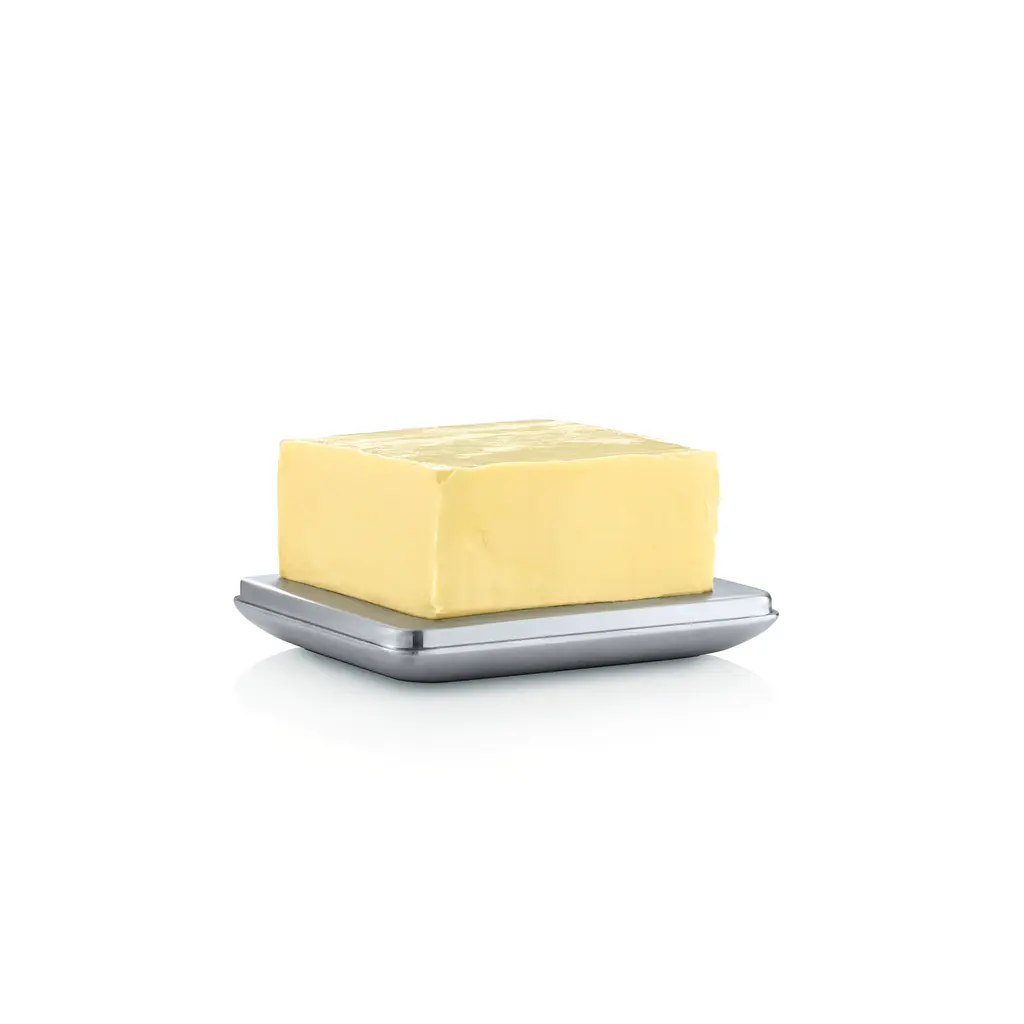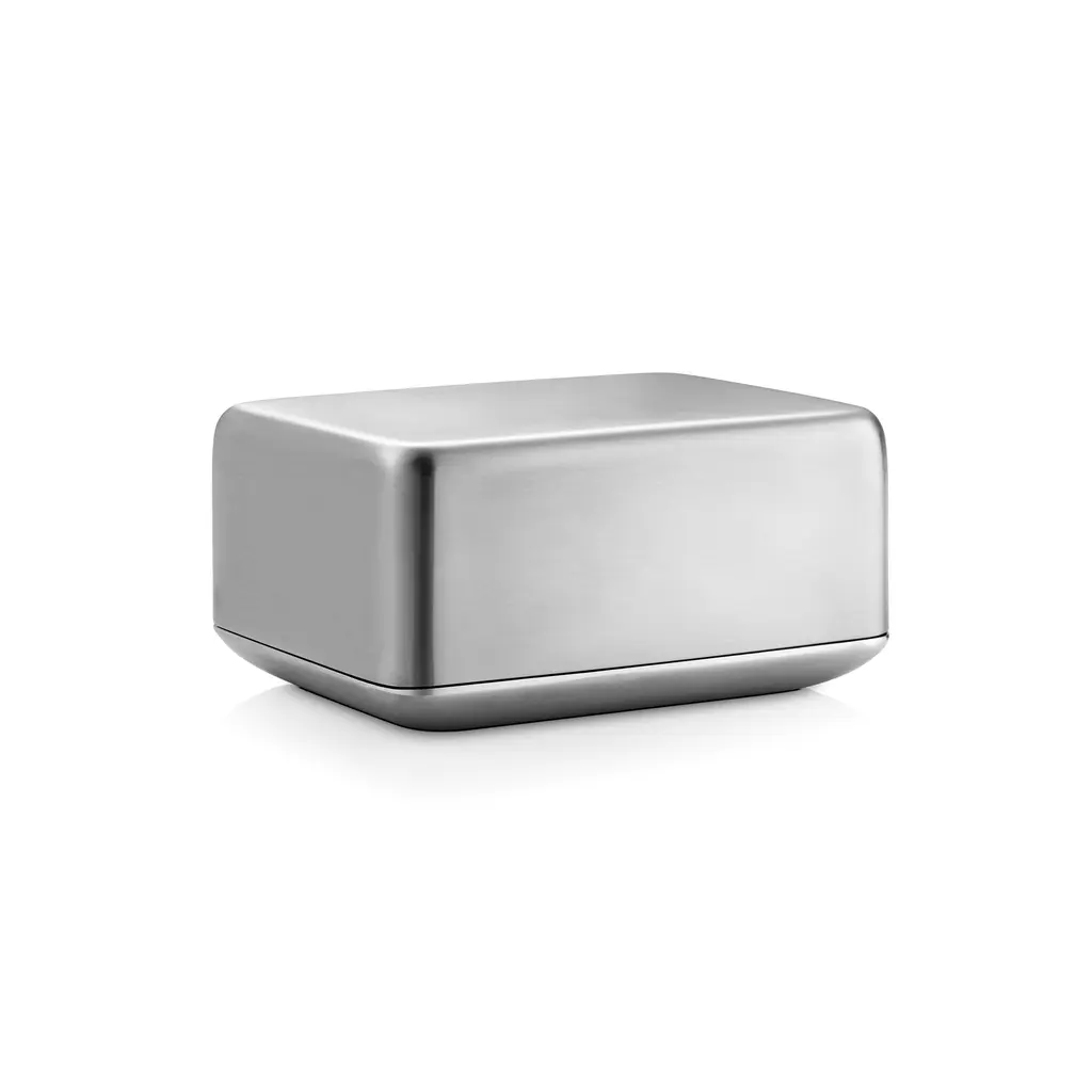 Minimalist and practical, the Blomus Stainless Steel Butter dish offers an elegant way to serve butter to family or guests. Suitable for any occasion, this design provides a modern take on classic butter dishes thanks to a clean rectangular form, subtly rounded edges, and brushed stainless steel material. The base is double-insulated for extra protection. Additionally, this stainless steel butter dish with lid helps to keep the contents fresh for longer. The cover protects the butter from exposure to air and light to prolong its freshness. At the same time, the lid ensures that the table or countertop look tidy and elegant. This stainless steel butter dish with lid comes in two sizes, small and medium.