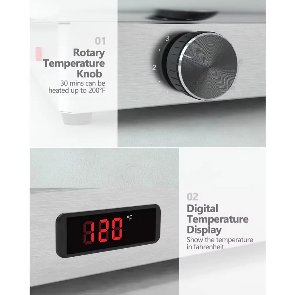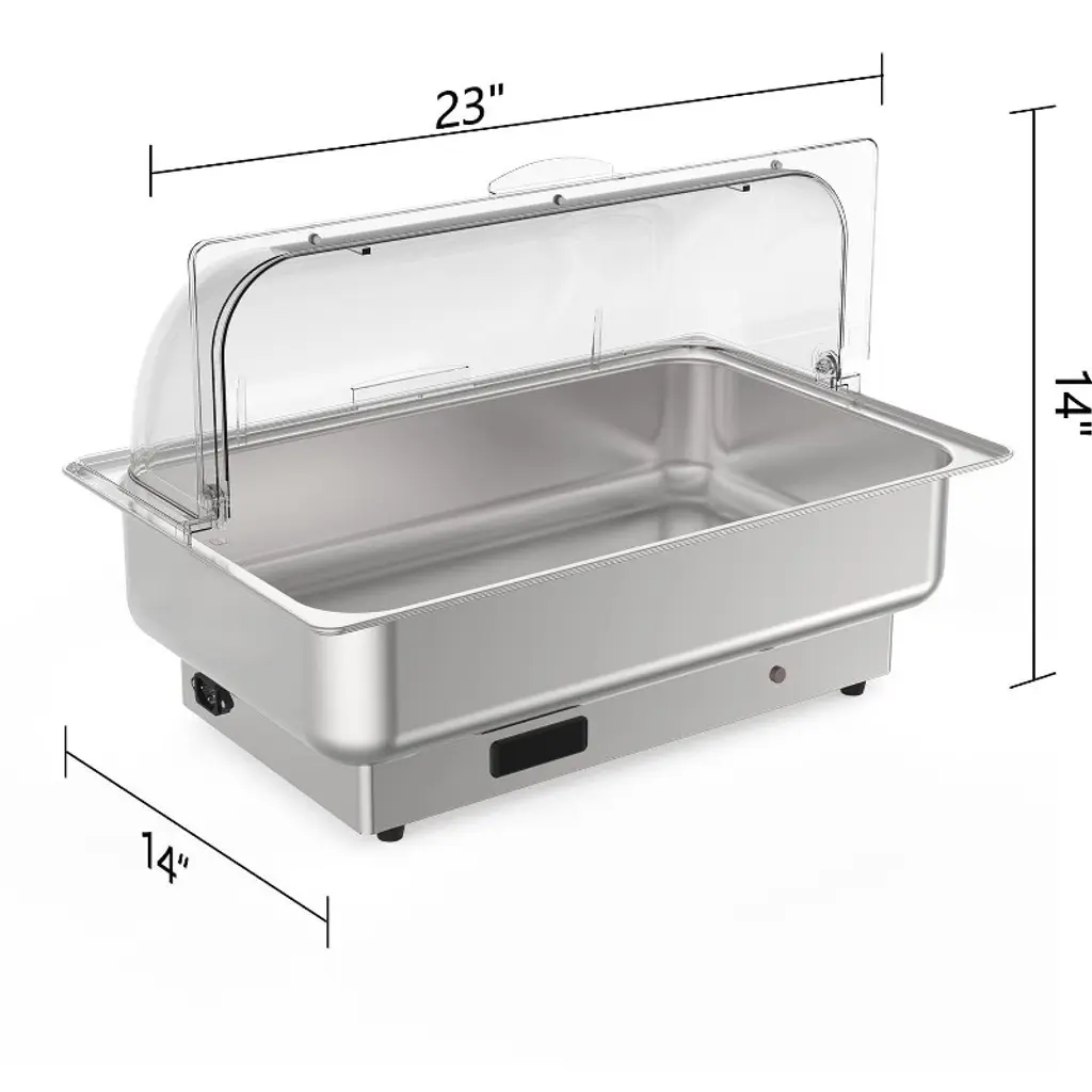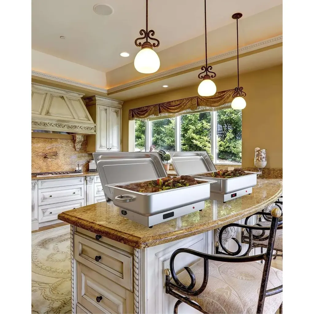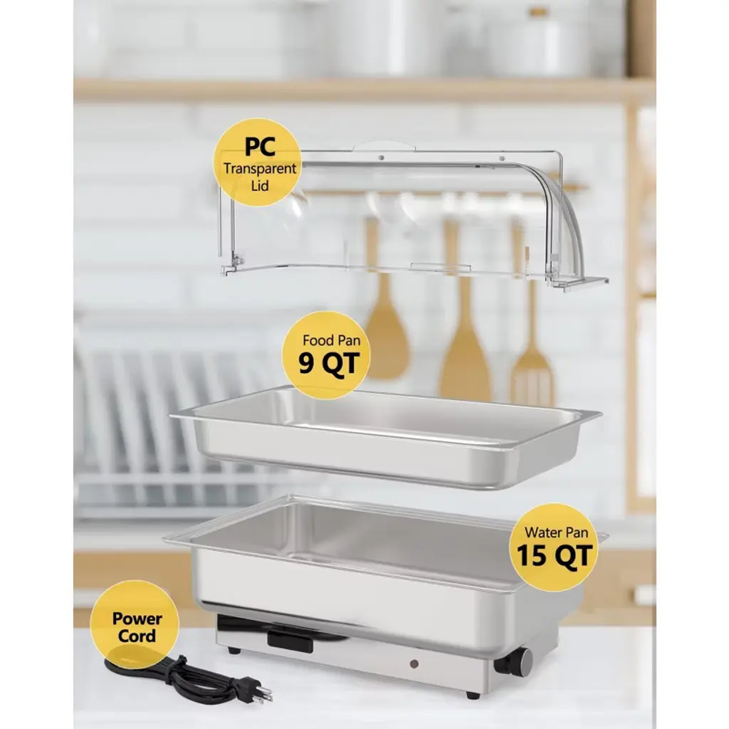Professional 2-Pan Stainless Steel Chafing Dish Set - Dual 4.5QT Buffet Warmer with Temperature ControlKey Features?? Dual-Pan Flexibility - Includes two 4.5QT half-size pans (9QT total) for serving multiple dishes simultaneously??? Precise Temperature Control - Adjustable 86¡ãF-200¡ãF (30¡ãC-93¡ãC) range with energy-efficient 400W heating??? Commercial-Grade Construction - NSF-certified stainless steel pans ensure food safety & durability?? Clear View Lid - Transparent PC cover monitors food without releasing heat? Efficient Performance - 15QT water pan provides consistent, even heatingTechnical SpecificationsMaterial: NSF-certified 18/8 stainless steel food pans BPA-free polycarbonate lid Dimensions: 23"L ¡Á 14"W ¡Á 14"HCapacity: 15QT water pan 2 ¡Á 4.5QT food pans (2.6" deep) Electrical: 400W heating element Standard 120V operation Included Components:1 ¡Á Integrated water pan2 ¡Á 4.5QT half-size food pans1 ¡Á Transparent PC lid1 ¡Á Power cord1 ¡Á Instruction manualWhy This Chafing Dish Stands Out? Space-Smart Design - Dual pans maximize serving options in compact footprint? Professional Results - Maintains perfect food temperature for hours? Easy to Clean - Dishwasher-safe components save cleanup time? Versatile Use - Ideal for buffet lines, catering, and large gatherings