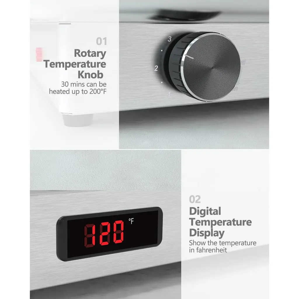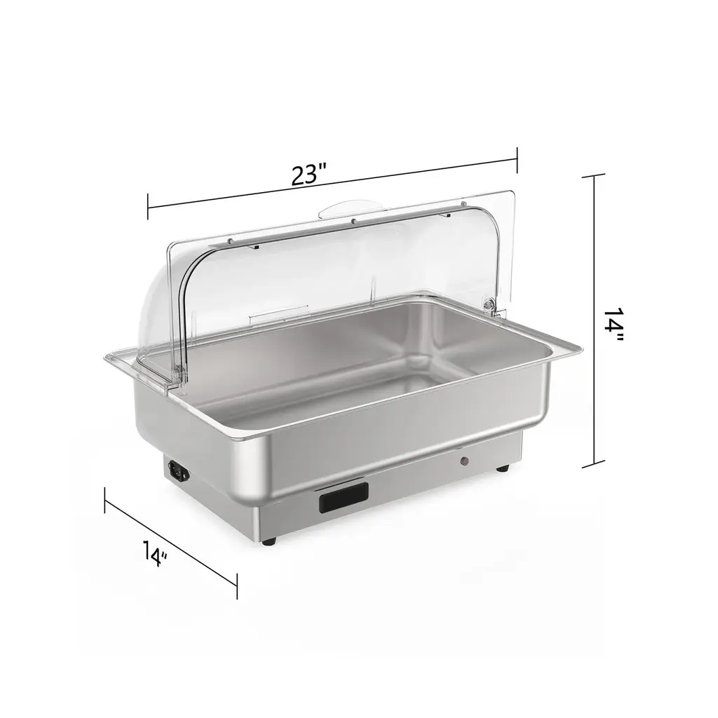 【Temperature Control & Display】Powered by a 400W built-in heating element, after fill the water pan with water, it can be easily adjust the thermostat between 86°F and 200°F(30°C and 93°C) to suit your food service requirements, low power consumption higher efficiency. 【Dimension & Capacity】Size:23"x 14"x 14", 15QT water pan, 9QT food pan (2.6 in deep) can serve at least 8 people. 【Food Grade Stainless Steel & Roll PC Lid】Warming trays for buffets party is made of food grade stainless steel with a 1/1 NSF-certified food pan. PC lid is made of non-toxic and environmentally friendly PC material. 【Wide Application】Large capacity electric chafing dish can serve a lot of guests, it is a good choice for hosting parties and holiday dinners. Such as catering, parties, restaurants, buffets, hotels, wedding brunches. 【Package Contains】Integrate water pan * 1, Full-size food pan * 1, PC Lid * 1, Power cable * 1, Instruction manual * 1.