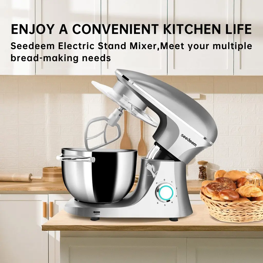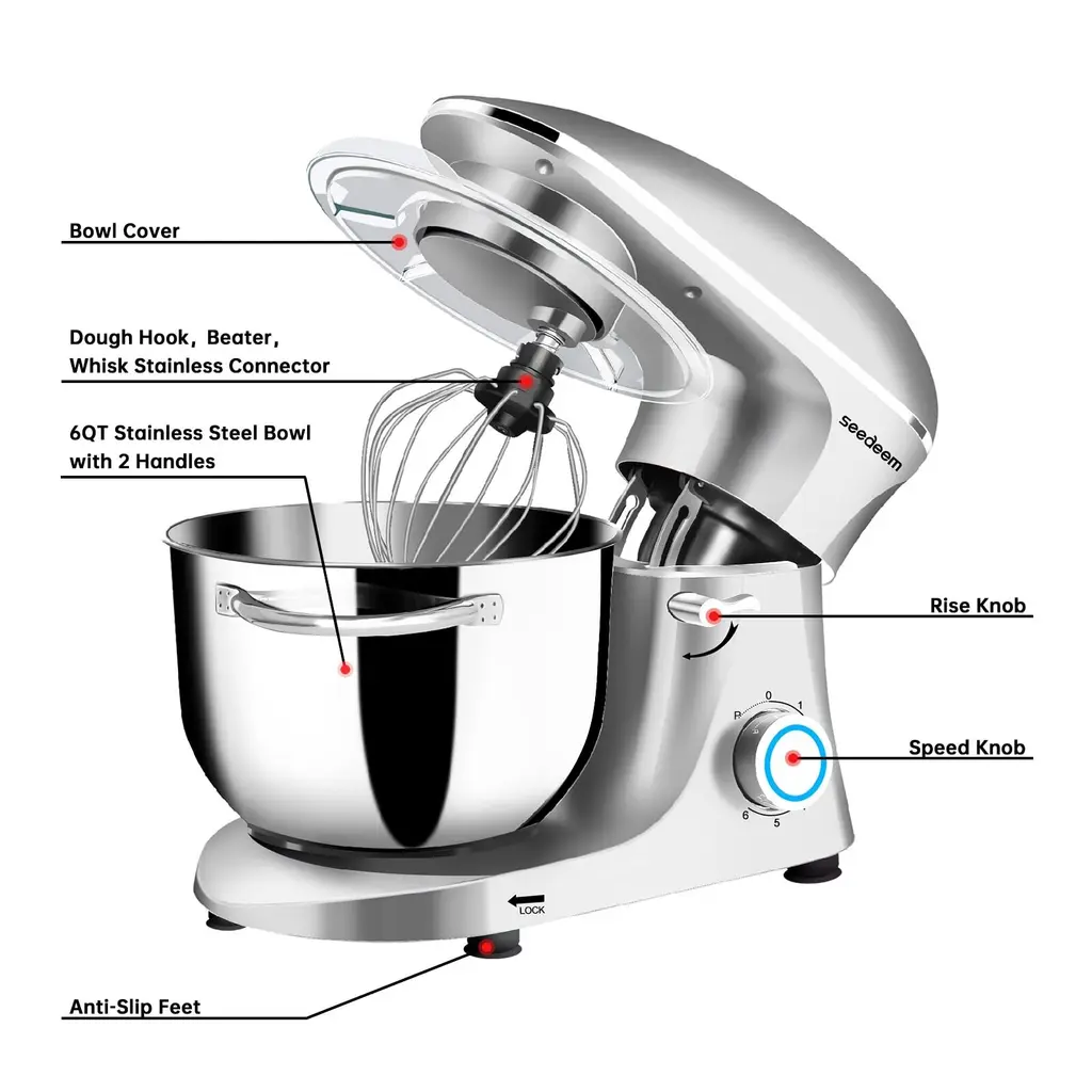 【660W Motor and 6 Speed Options】Kitchen Stand Mixer is equipped with a 660W high performance motor and runs with low noise; by turning the gear knob, you can choose 6 different gear speeds, the machine can mix steadily from low to high speed, helping you to make delicious food. 【6 QT Large Capacity】6 QT large capacity mixing bowl is made of food grade 304 stainless steel material to fully ensure food safety. The large capacity can meet the daily use of 2-6 people family, easy to make biscuits, bread, cakes, mashed potatoes, salads and other delicious food. And the mixing bowl is also equipped with a comfortable handle, easy to use and save energy. 【Thoughtful Design]】The tilting head is equipped with a lifting spring that cuts off power when lifting, making it easier and safer to install and remove the bowl or other accessories. Thickened non-slip base and suction cup base design make it more stable when placed on the table during operation. 【High quality food grade accessories】The mixer comes with a dough hook, whisk and removable splash guard. The whisk mixes proteins, creams and other ingredients at 360° speed. The dough hook features an S-shaped design for stronger, more efficient dough mixing. The metal mixing paddle has a bold design for even, thorough mixing of ingredients. 【Service Online】The stand mixer can handle the daily baking and cooking needs of most families. If you have any problems during use, please contact us first. We provide 24/7 online after-sales service for you.
