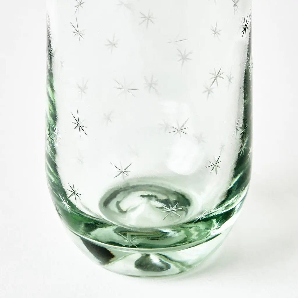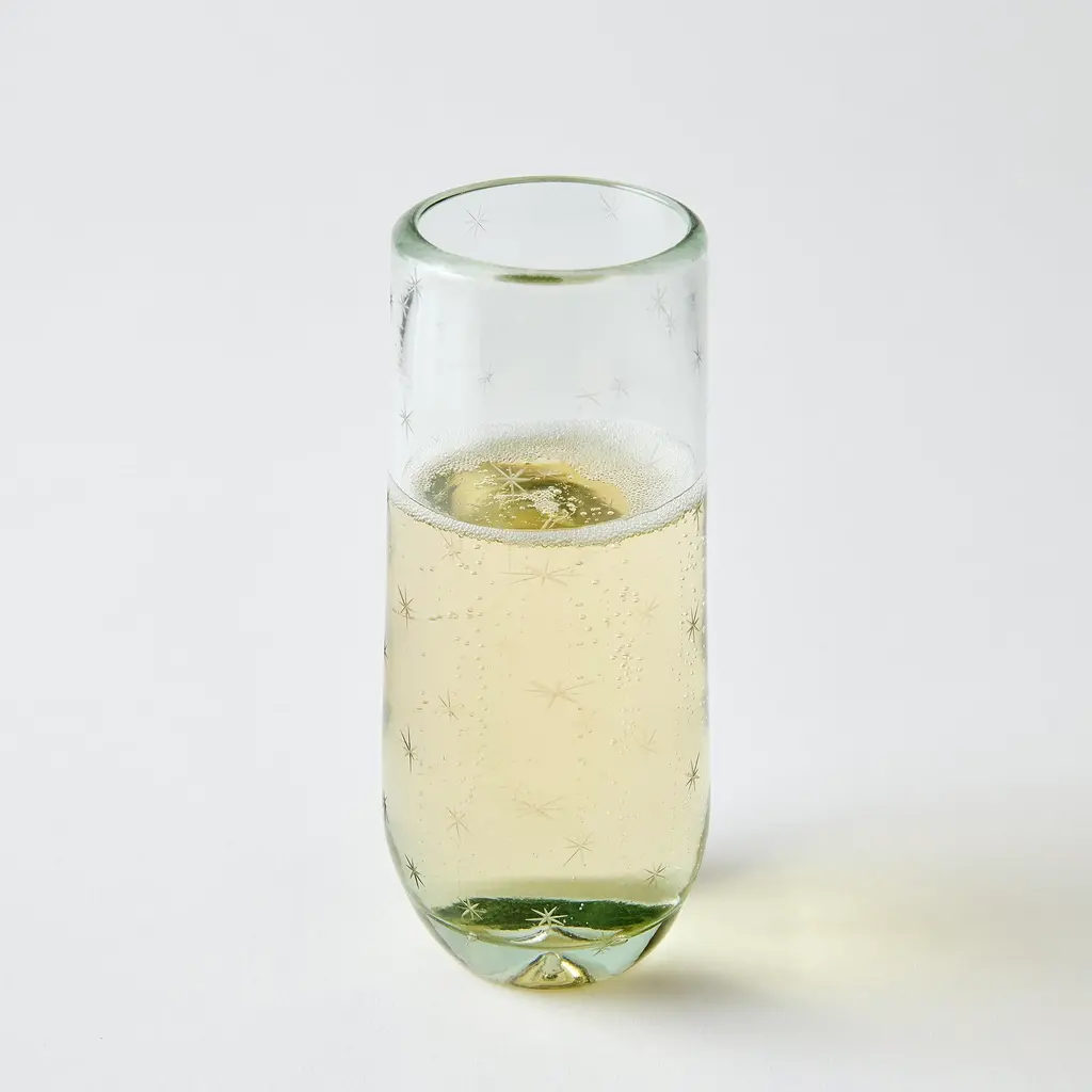 Bring the night sky to your table with the Starry Night Stemless Champagne Glass. Handcrafted in Central Mexico from recycled glass, it’s delicately etched with stars that capture the magic of a starlit evening. Its stemless silhouette offers a modern, comfortable grip—perfect for sparkling wine, cocktails, or even juice at brunch. Durable enough for everyday use yet timelessly elegant, it’s a piece that blends sustainability with celestial charm.