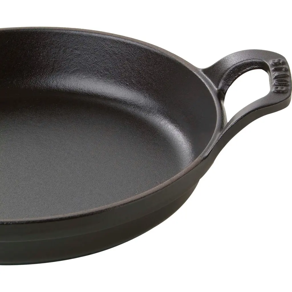 For centuries, cooks have taken advantage of the natural heat retention and redistribution properties of cast iron. Staub builds on this tradition with our enameled cast iron cookware. Black matte enamel inside and cooking surface creates a culinary advantage for better browning, braising, and roasting. Colorful enamel outside adds flare to your kitchen and table. Safe for use on all types of heat sources, including gas, electric, and induction, and oven safe up to 500F. Chip resistant and dishwasher safe. Made in France.Made in FranceOven Safe up to 500FSmooth enamel bottom works on all stovetopsEach piece is one of a kindRough texture results in exceptional browningRequires no seasoningDishwasher safe.