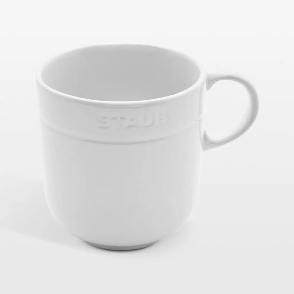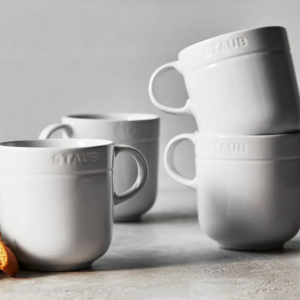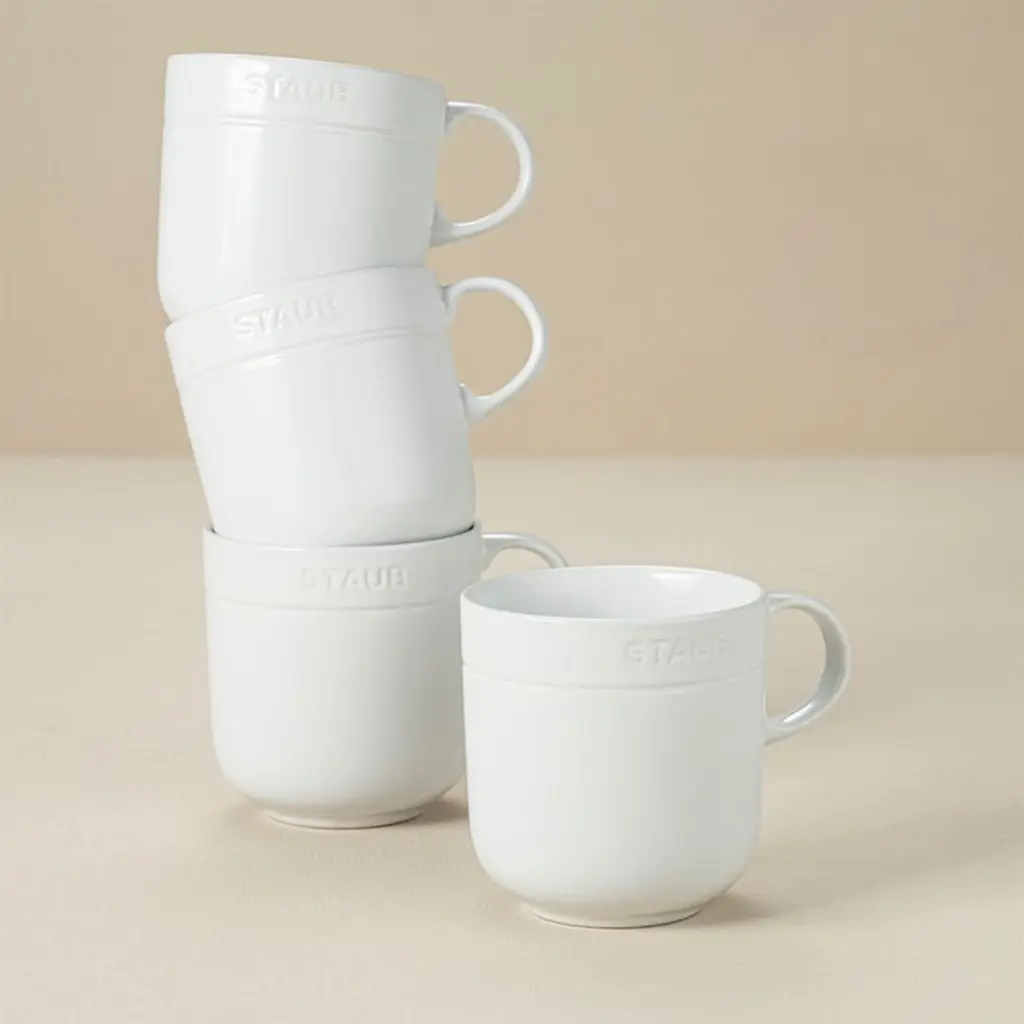 The timeless style and quality of Staub cookware comes to the table with this handsome set of four mugs. Finished with durable white porcelain enamel, the stoneware coffee cups resist scratches, moisture and thermal shocks. Each glossy white mug is detailed with a debossed ring and the classic Staub logo. Once the meal is complete, the set cleans up easily in the dishwasher.