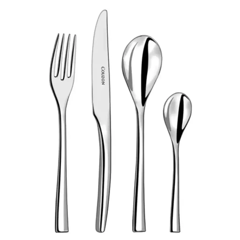 Every piece in the Steel stainless steel flatware line boasts a clean, modern bent that is just perfect for everyday use. - Five-piece place setting includes Table Fork, Table Knife, Medium Teaspoon, Dessert Spoon, & Dessert Fork. - Four-piece hostess set includes Cake Lifter, Two Serving Spoons, & Serving Fork. - Service for 8 includes eight place settings, one serving spoon and one serving fork. - Service for 12 includes twelve place settings and one 4-piece hostess set. For over 60 years, Couzon has created contemporary, sleek flatware that emphasize balance and harmony.