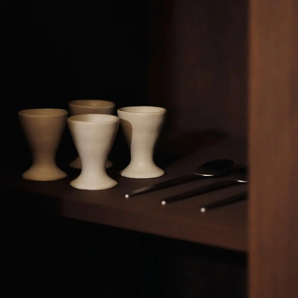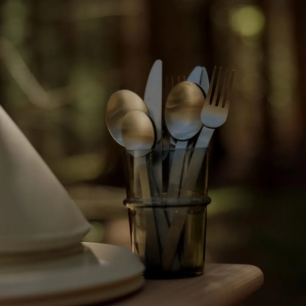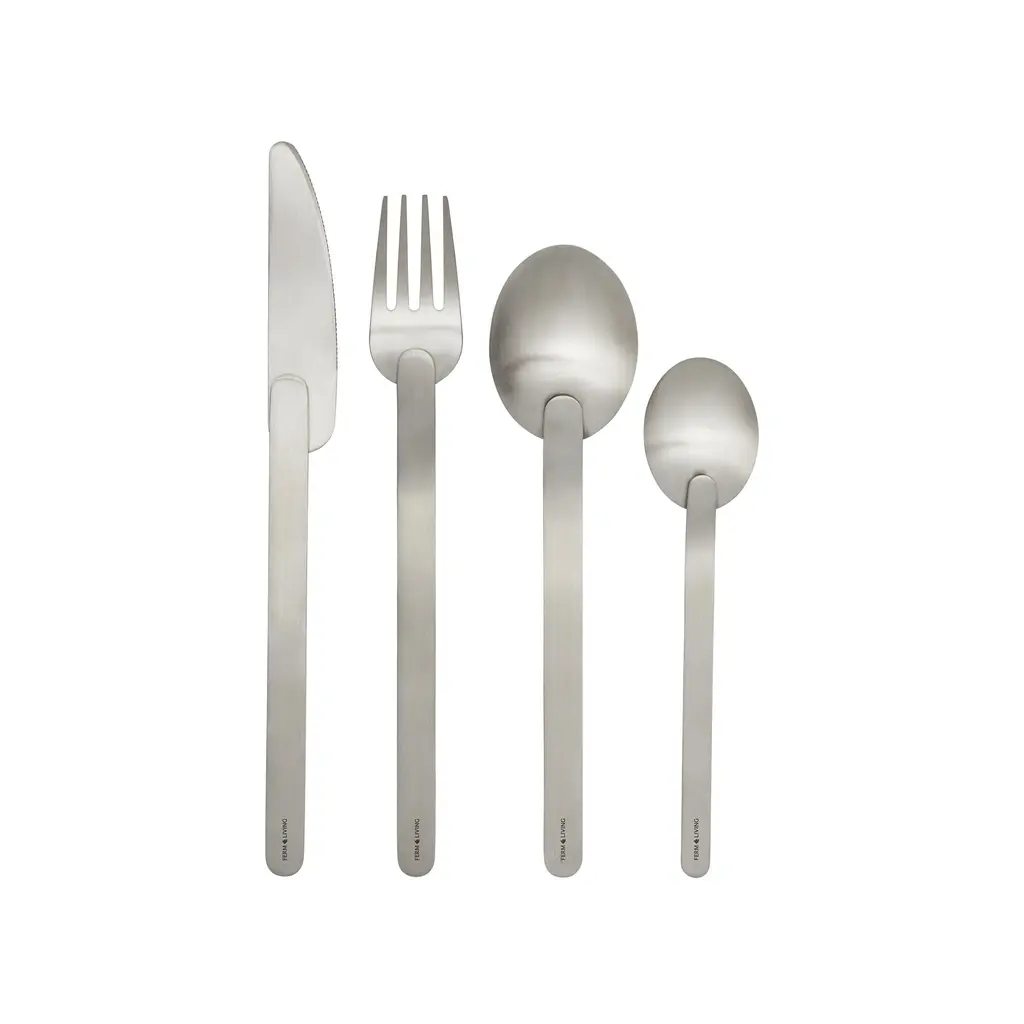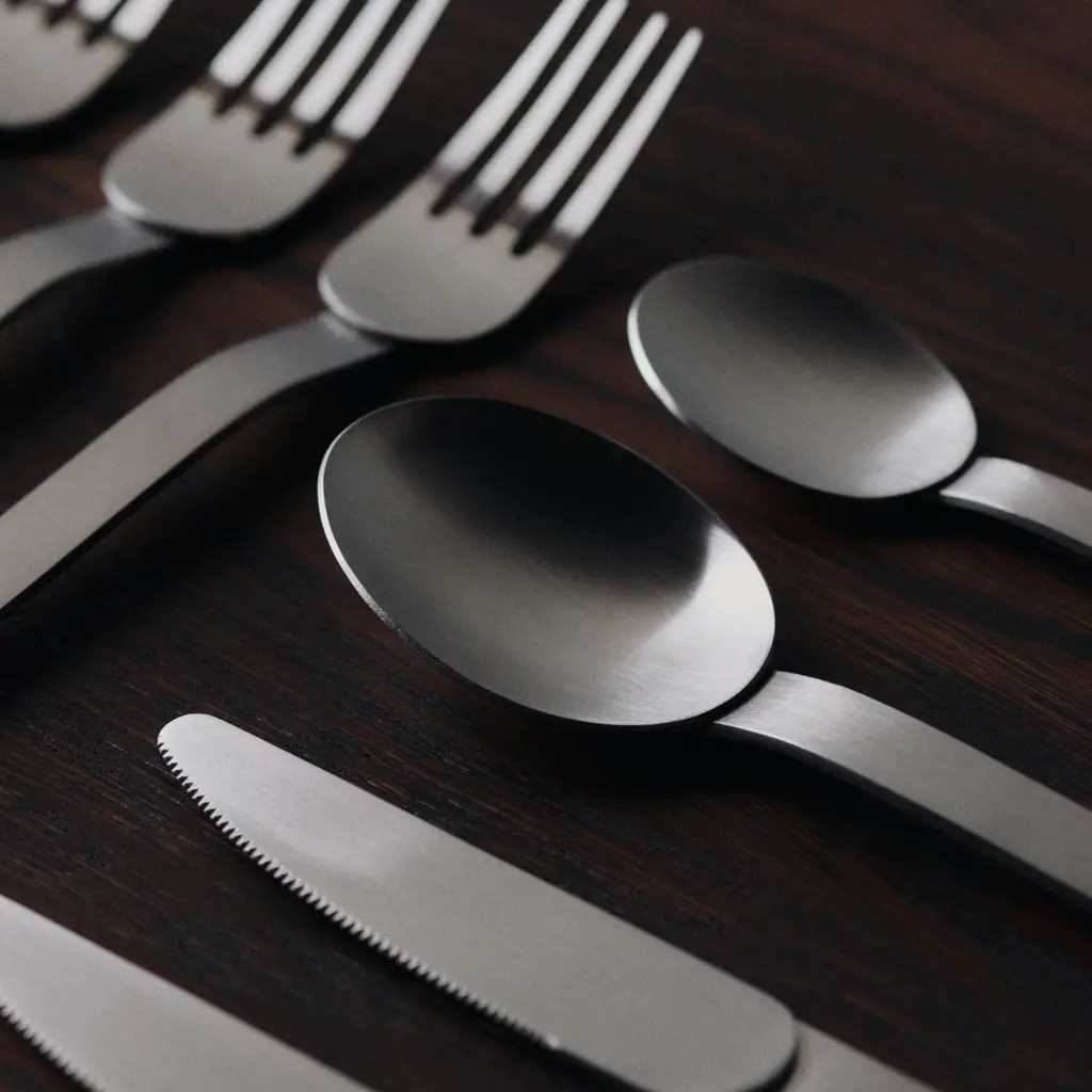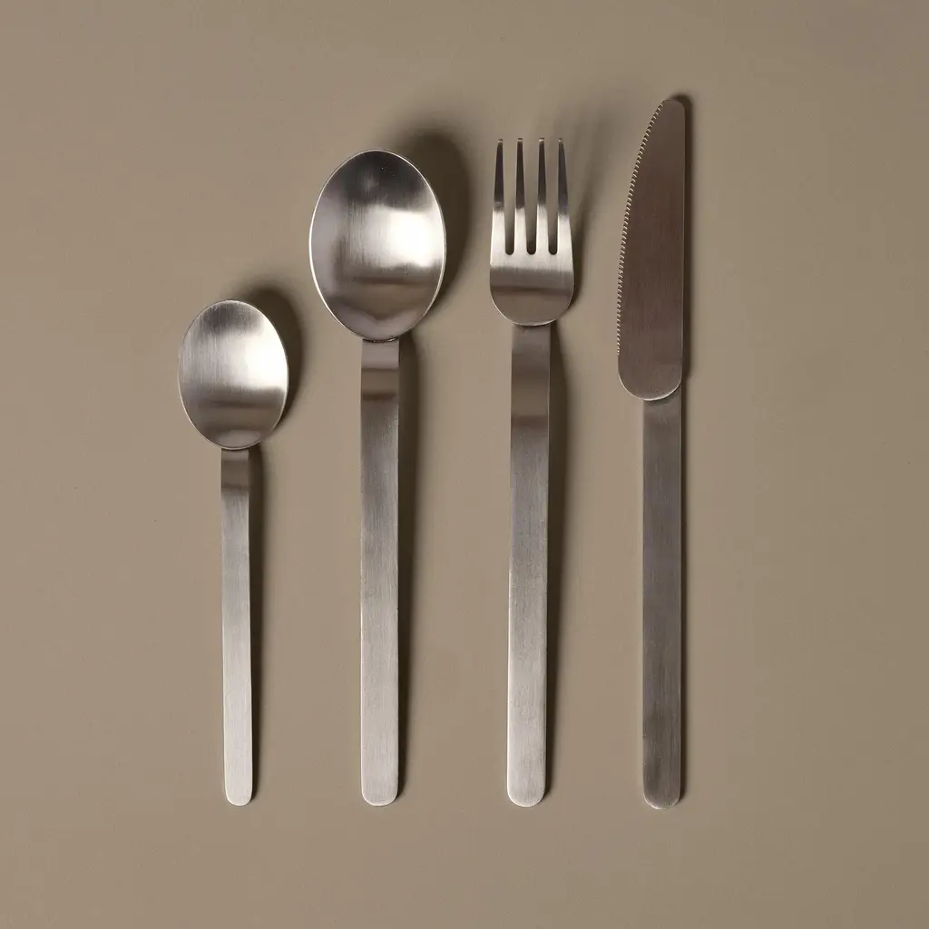 A set of Bauhaus flatware reduced to its essentials: clean lines, geometric clarity, and a quiet architectural presence on the table. Ferm Living’s Stelo Cutlery takes its name from the Italian word stelo, meaning stem, paired with steel. Each piece is shaped from brushed stainless steel into an elongated, stem-like profile—flat handles leading to rounded heads that rest gently atop the handle line. Invisible welds and subtle bends give the set a seamless look while keeping it comfortable in hand. The four-piece set includes a dinner knife, fork, spoon, and teaspoon. Brushed to a matte finish, the surface feels refined without being overly polished, making it suitable for both everyday meals and more formal gatherings. Durable, food safe, and minimalist by design, it’s Bauhaus thinking translated into flatware.