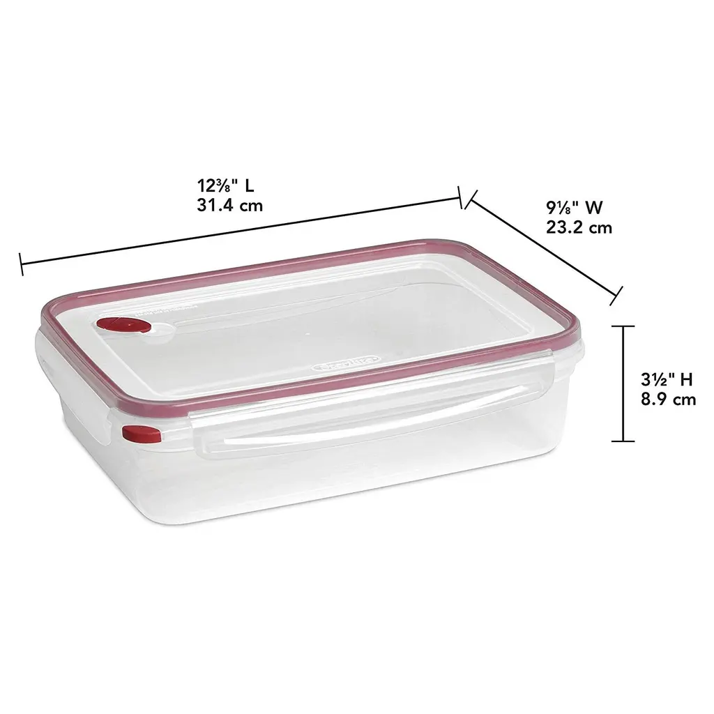 Store your leftovers or send brownies to a friend with this 8-Pack of the Sterilite 16 Cup Rectangle UltraSeal Food Storage Container, Red Take your favorite foods to-go with the Sterilite container, featuring a color-coded matching system to help find the correct lid and base combination without rummaging through the cupboards in your home. When microwaving, don't worry about warping; A vent in the lid releases steam to preserve container integrity. Tidy up and store all containers efficiently when stacking them in the fridge during meal prepping or when tucking them away in the cupboard. This container is ideal for storing larger food items, such as baked goods, casseroles or corn on the cob. The gasket and four latches in the lid create an airtight and watertight seal that keeps food fresh and prevents liquids from leaking. Meal prep with confidence and utilize the 16.0 cup container in the fridge or freezer. Eat with confidence knowing there is no BPA or phthalate mixing with your food. Enjoy an organized, food-safe storage setup with 8-Pack of the Sterilite 16 Cup Rectangle UltraSeal Food Storage Container, Red 8-pack of 16.0 cup food storage containers for storing large baked items or meal prep for the week Color-coded lids match their bases for easy identification and use Tight gaskets seal in your food with corresponding 4-latch lids Provides watertight seal to minimize accidental smells and spills in your fridge Microwave-inspired vent releases steam when microwaving dishes No BPA or pthalate used; Keeps food fresh and healthy Safe for freezer, microwave, and dishwasher Size: 16.0 cups Material: Plastic Color: Clear, red Dimensions (L x W x H): 12.375 x 9.175 x 3.5 inches Manufacturer warranty: 1-year warranty Quantity: 8