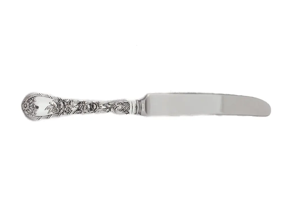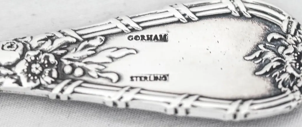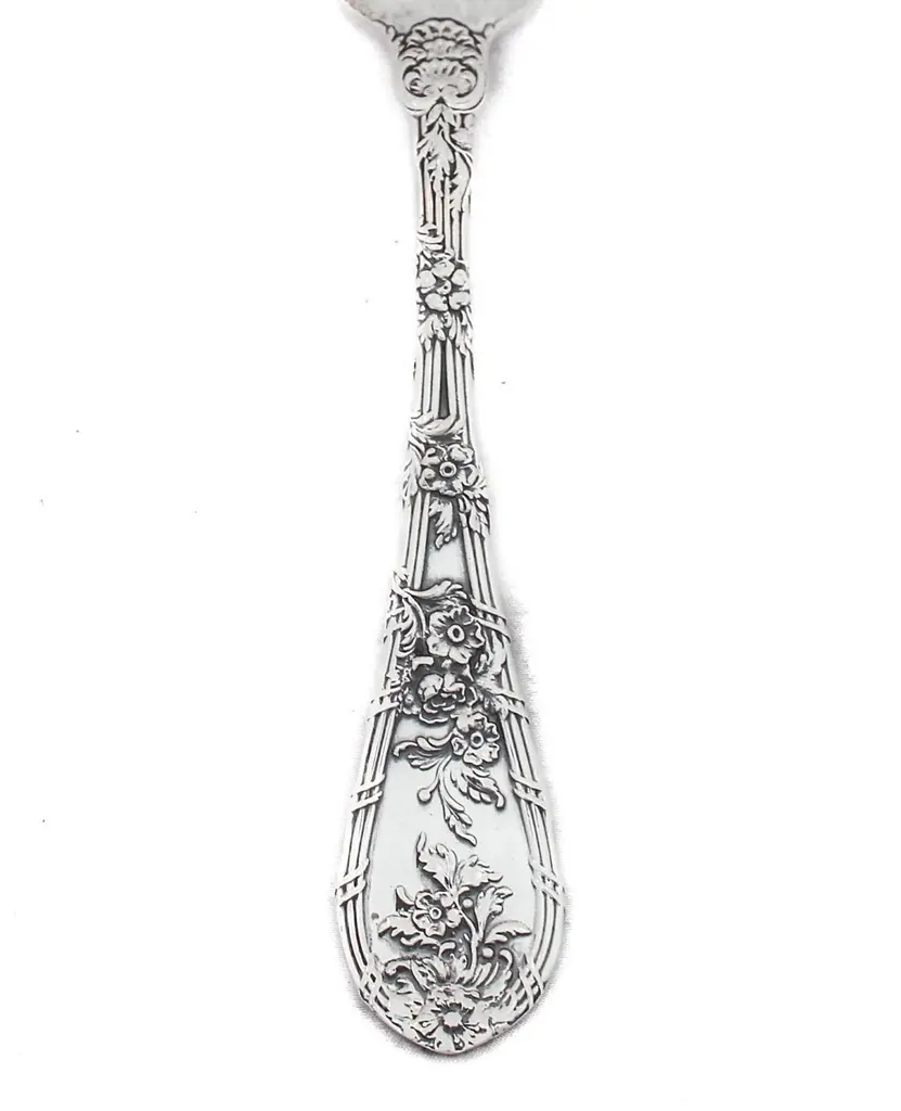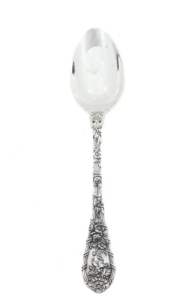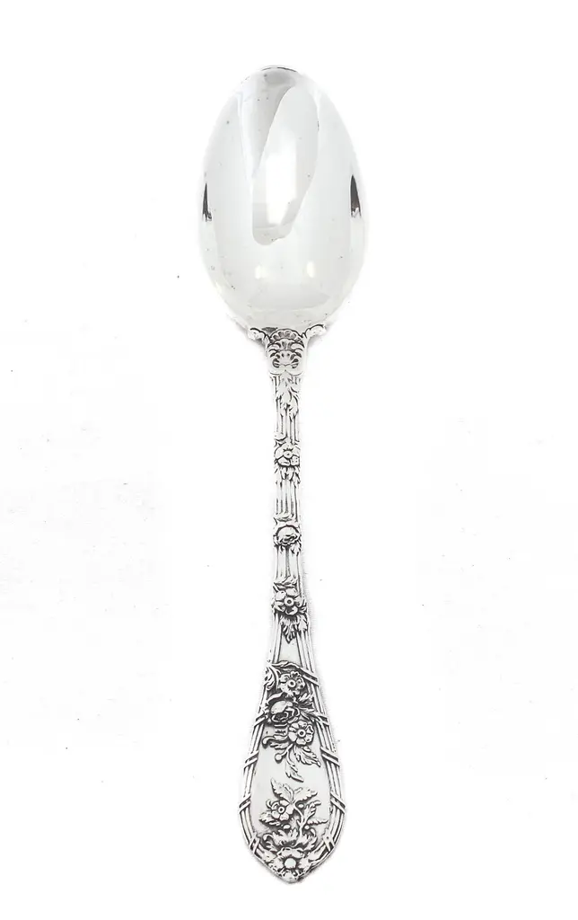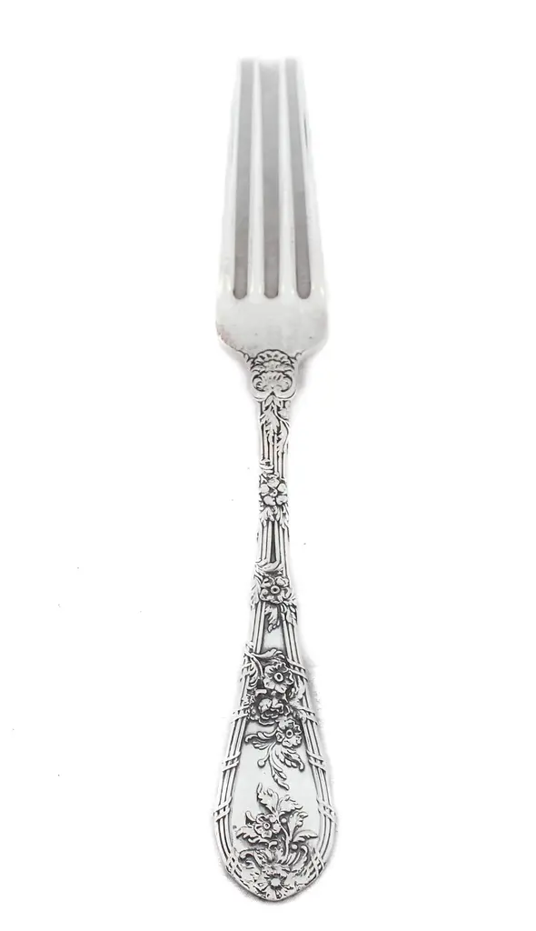 Being offered is a sterling silver flatware set by William Durgin Silver. This is a service for 12: 5 pieces per setting, 60 pieces total. The craftsmanship and design on this pattern is simply stunning. Raised flowers wrap around each handle giving each individual piece the illusion of flowers on a trellis. The design is found on both the front and back sides. The salad fork even has flowers up to the tines.