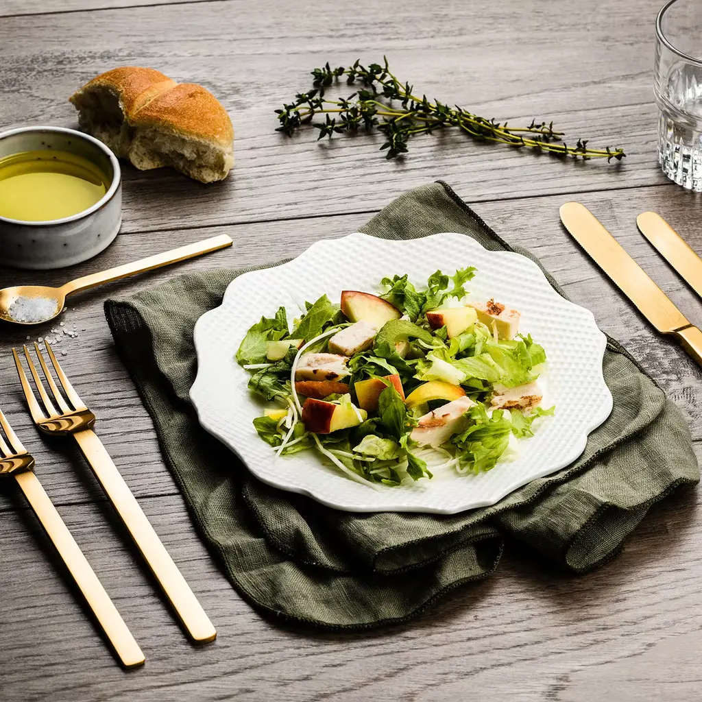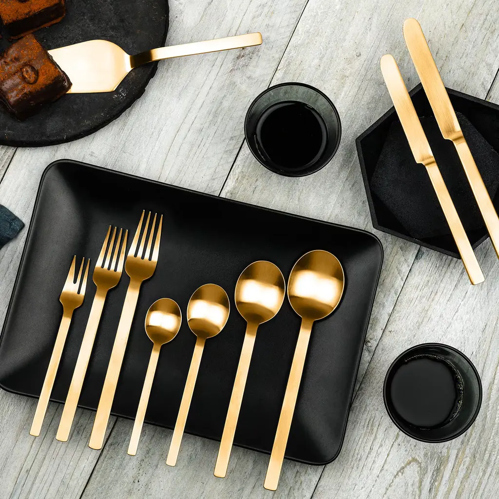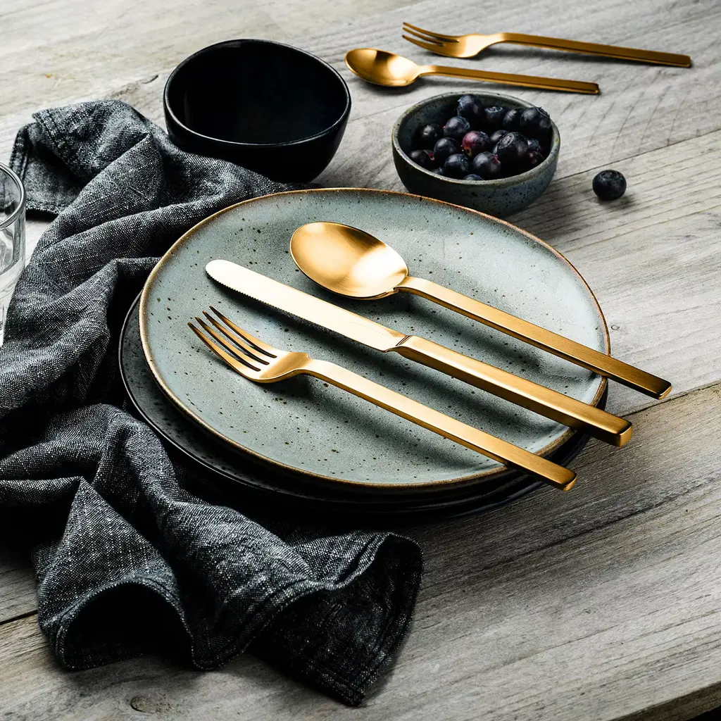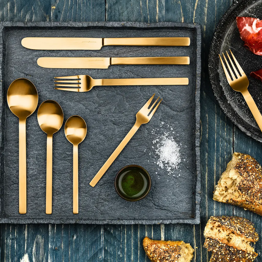 Mepra's artisan tradition and Pininfarina aesthetic research combine to create the Stile Collection that epitomizes elegance, purity, and innovation. Crafted of 18/10 stainless steel with brushed gold finish and a protective PVD titanium-based coating, the contemporary, essential design feature sleek handles, which have a square cross-section with rounded corners. This 5-piece set includes: table fork (20.5 cm), table knife (23.4 cm), dessert spoon (18.5 cm), dessert fork (18.5 cm), and coffee spoon (15.6 cm).