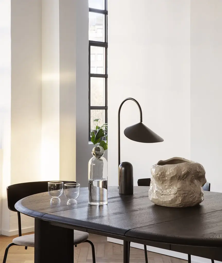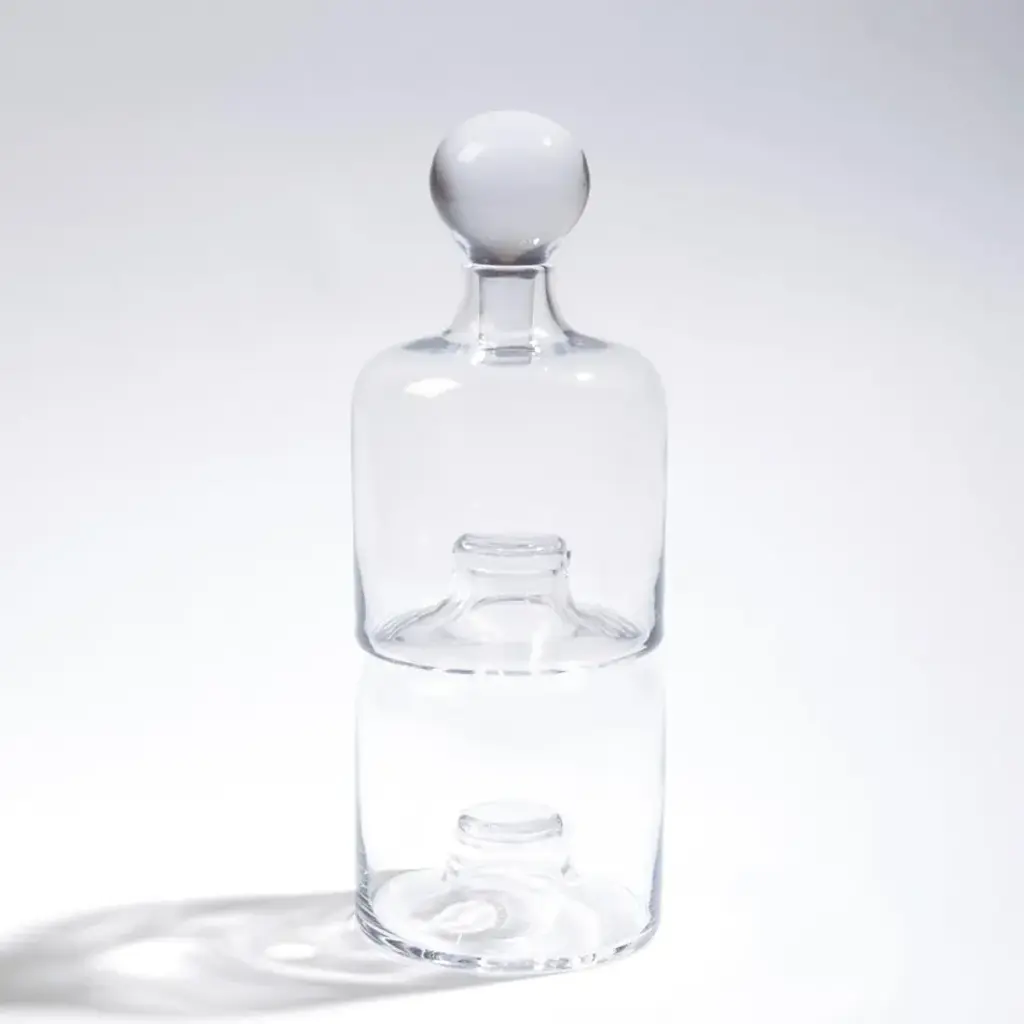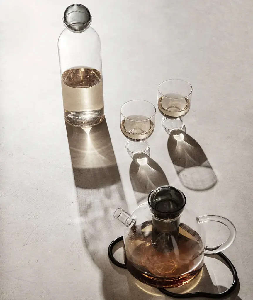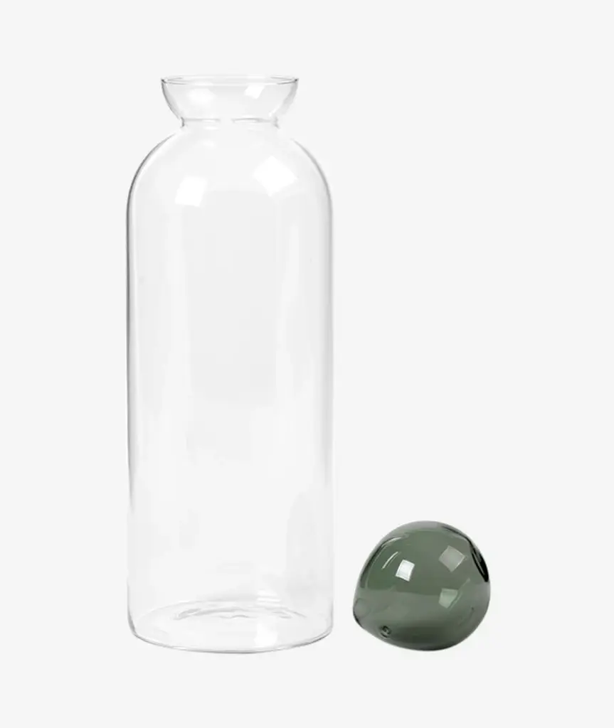 The Still series of glass tableware looks to traditional teamaking rituals, simplicity and balance to create everyday objects rooted in beauty and function. The sphere-shaped colored glass stopper sits like a bubble of air on top of the mouth-blown carafe, designed to elegantly hold water, juice or other liquids. Made for everyday use, pair it with the matching glasses to create a stylish set.