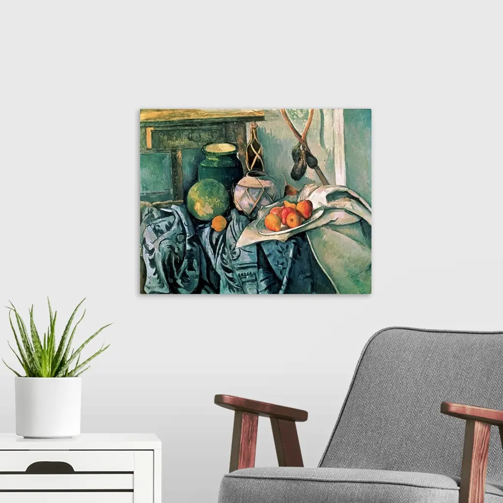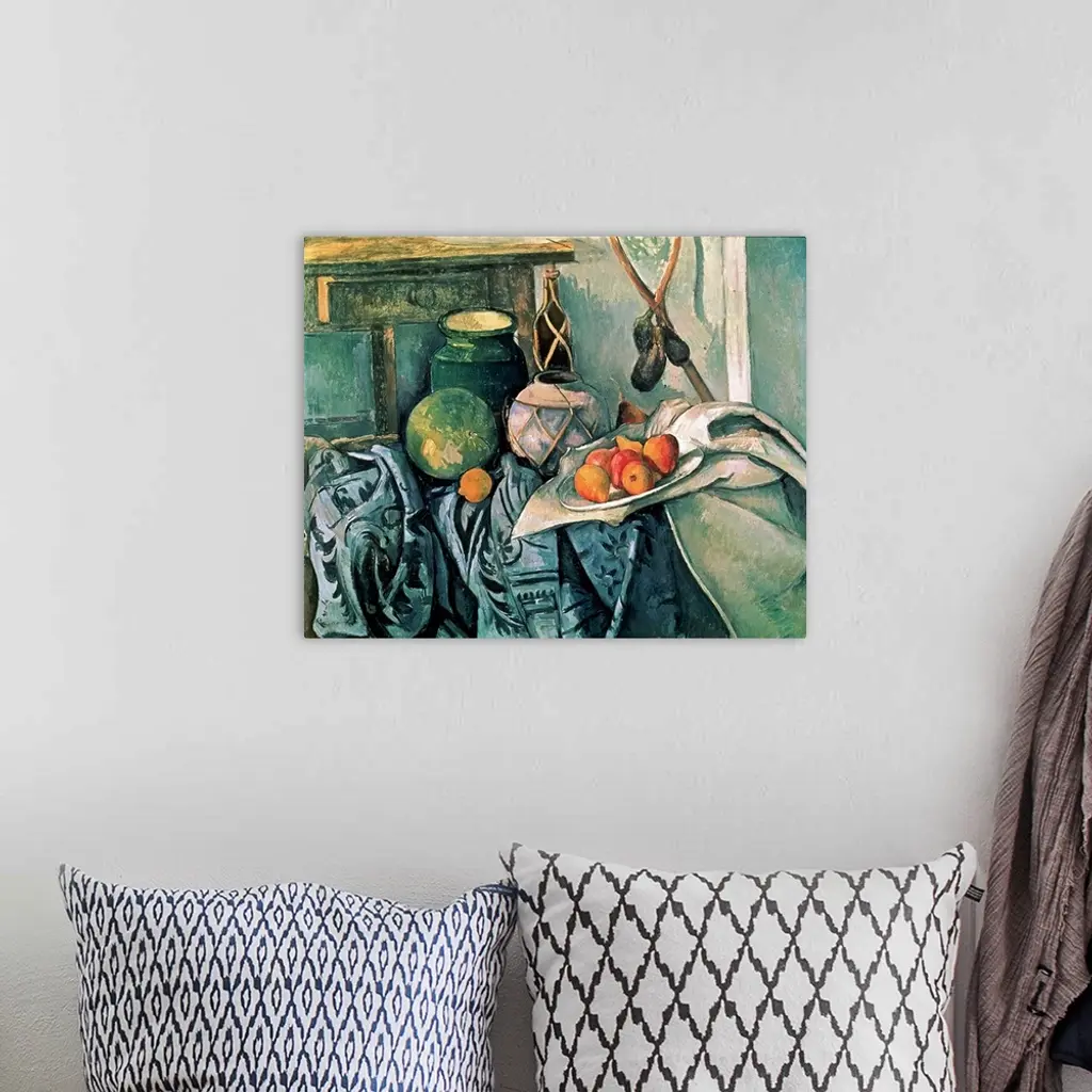 A plate of fruit and several pitchers lay on a cloth covered piece of furniture.