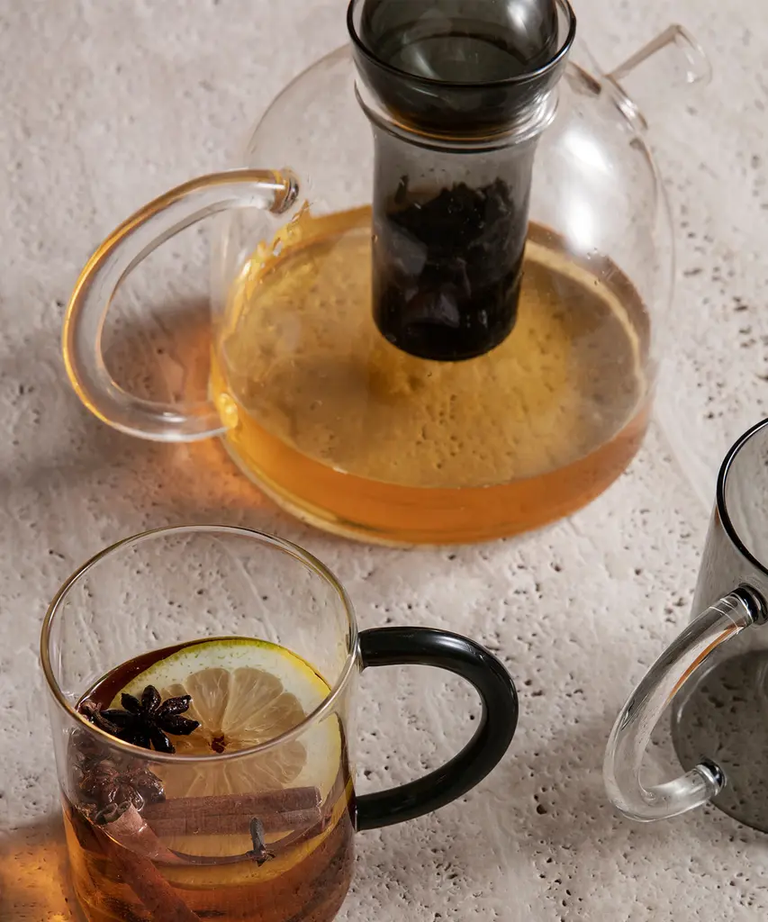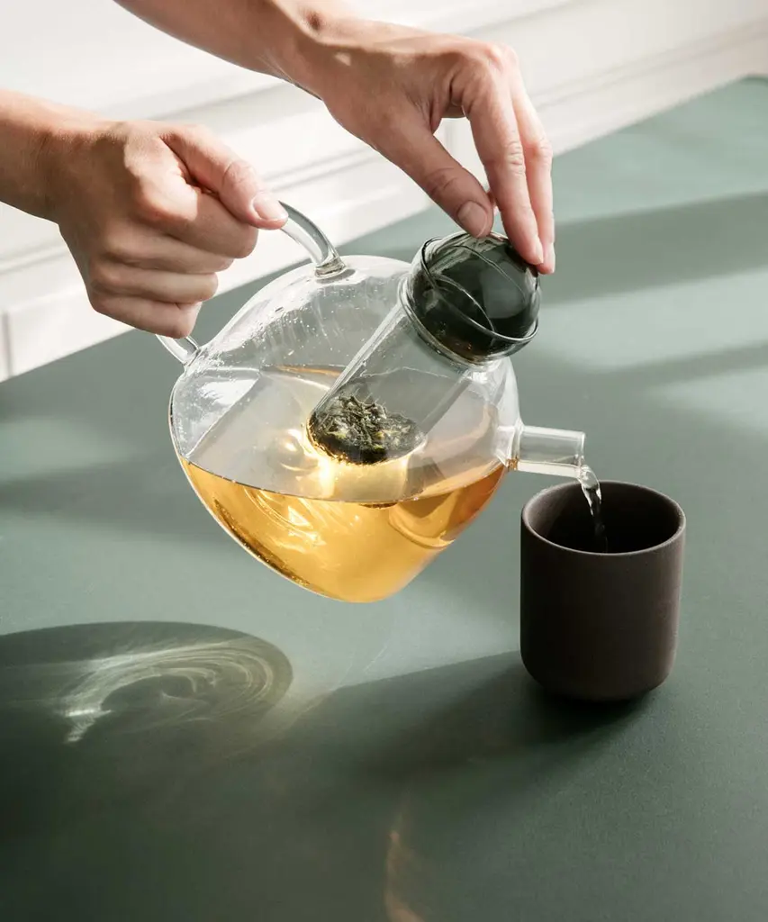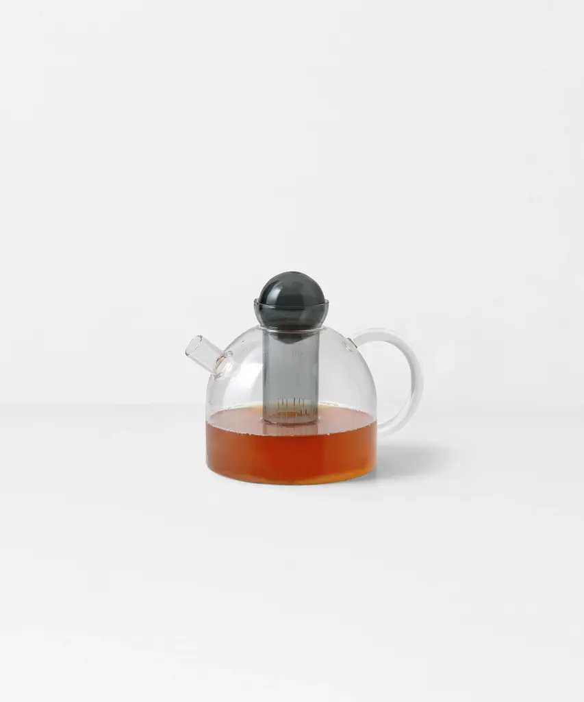 A contemporary take on a longstanding tradition. Crafted of contrasting transparent and colored mouth-blown glass, the Still Teapot uncovers the beauty of the brewing process. A rounded glass lid balances atop the brewing canister providing both form and function to this soothing daily ritual.Designed and produced by the Copenhagen-based studio Ferm Living.