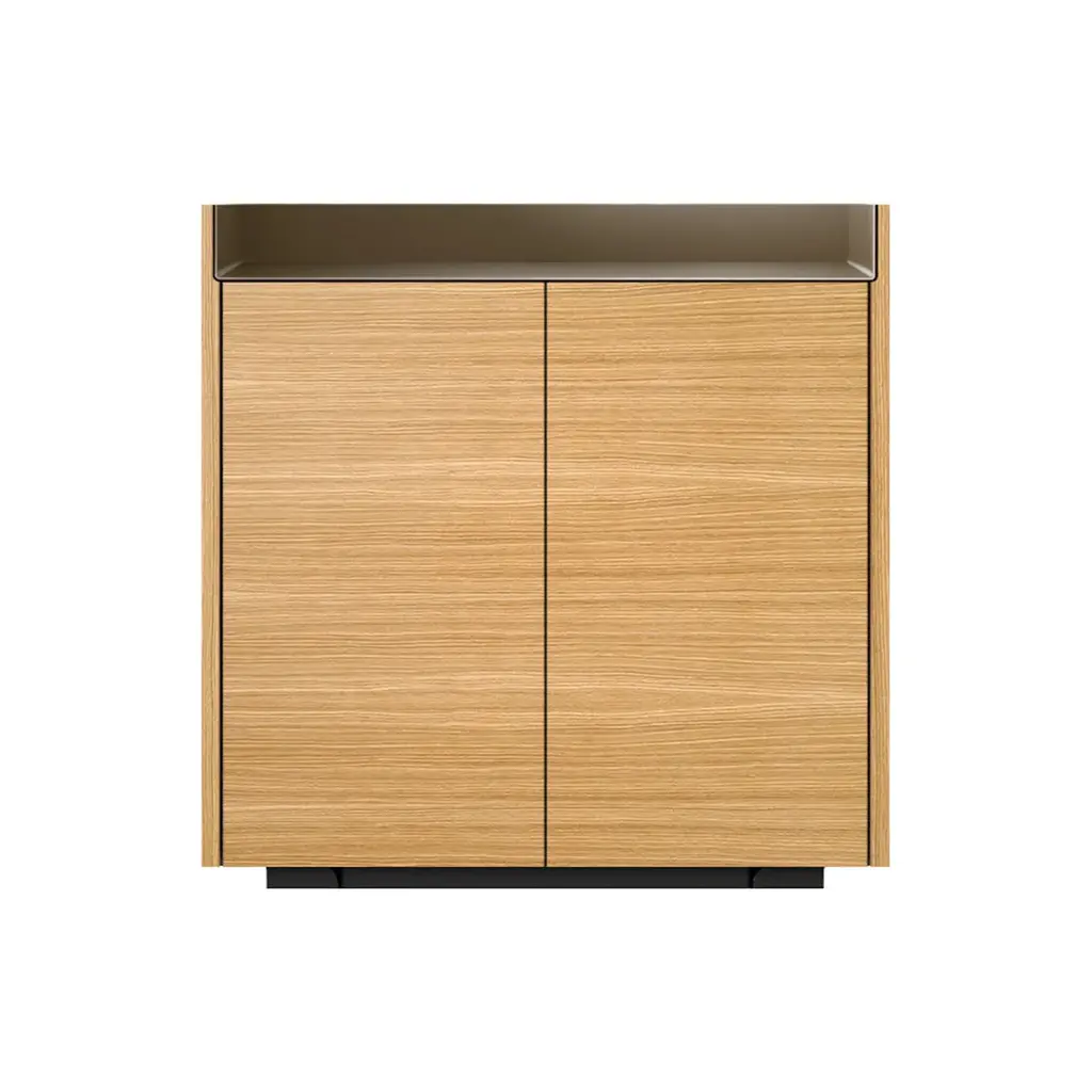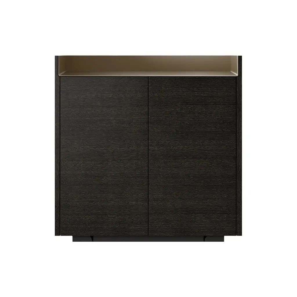 The Stockholm STH011 Cupboard features two doors and a plinth with adjustable feet for stability on various surfaces. Its top surface boasts a unique anodized aluminum finish, available in rose, bronze, gold, black, or chocolate, adding elegance to the design. Constructed from MDF E1 fiberboard and low-formaldehyde particleboard, it is veneered in natural oak or walnut, offering finishes to complement diverse interiors. Inside, height-adjustable shelves provide customizable storage solutions.