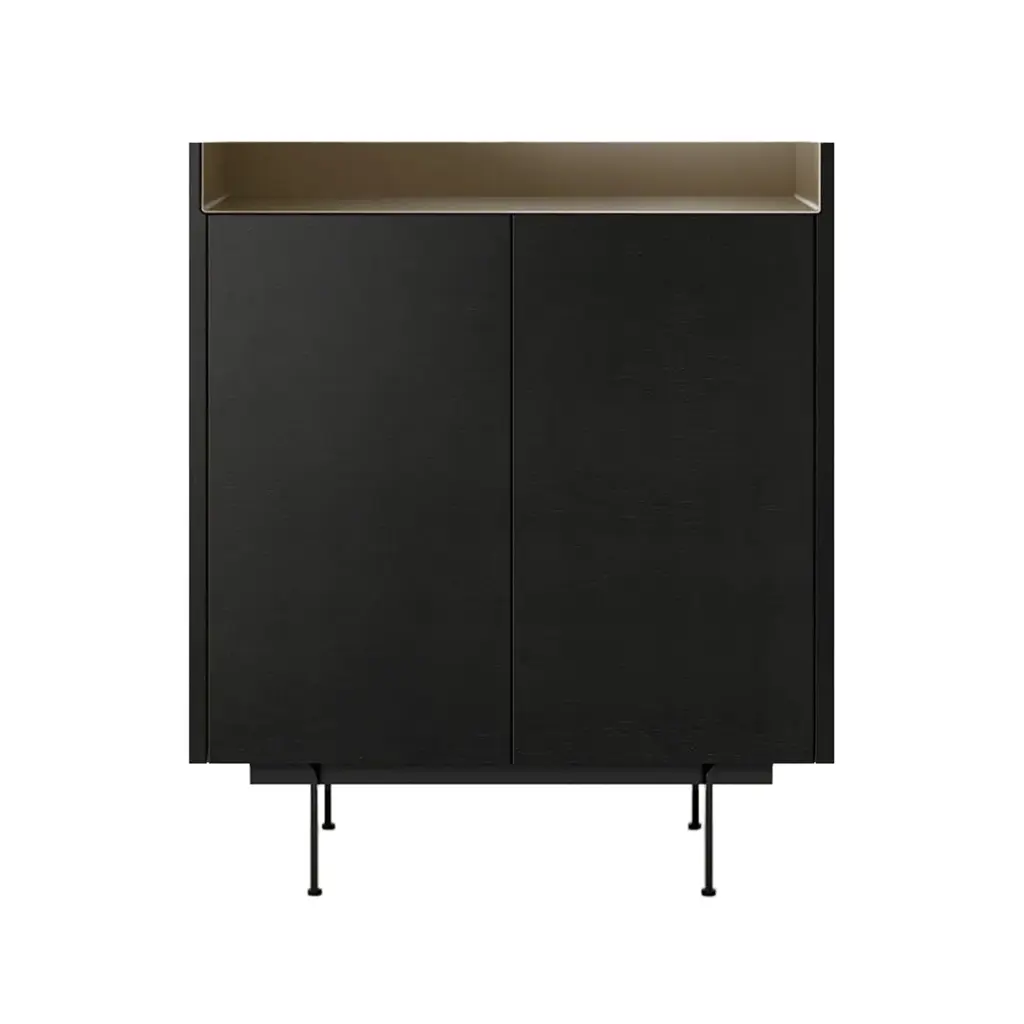 The Stockholm STH011 Cupboard is a distinguished piece from the Stockholm collection. This cupboard features two doors and is supported by a plinth with adjustable feet, ensuring stability on various surfaces. The top surface is adorned with a unique anodized aluminum finish, available in bronze, gold, black, or chocolate, adding a touch of elegance to the design. Constructed from MDF E1 fiberboard and low-formaldehyde particleboard, it is veneered in natural oak or walnut, offering a choice of finishes to complement diverse interiors. The cupboard includes height-adjustable shelves behind the doors, providing customizable storage solutions. The Stockholm STH011 Cupboard seamlessly blends functionality with a sophisticated design.