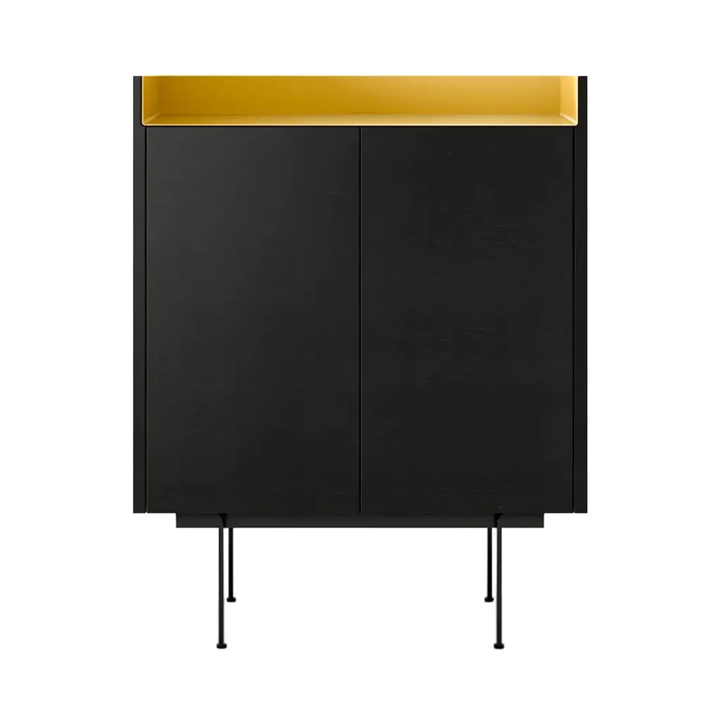 The Stockholm STH011 Cupboard is a distinguished piece from the Stockholm collection. This cupboard features two doors and is supported by a plinth with adjustable feet, ensuring stability on various surfaces. The top surface is adorned with a unique anodized aluminum finish, available in bronze, gold, black, or chocolate, adding a touch of elegance to the design. Constructed from MDF E1 fiberboard and low-formaldehyde particleboard, it is veneered in natural oak or walnut, offering a choice of finishes to complement diverse interiors. The cupboard includes height-adjustable shelves behind the doors, providing customizable storage solutions. The Stockholm STH011 Cupboard seamlessly blends functionality with a sophisticated design.