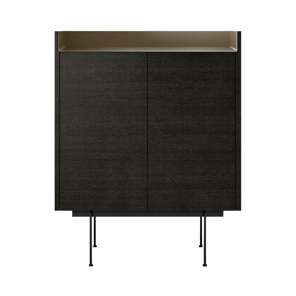 The Stockholm STH011 Cupboard is a distinguished piece from the Stockholm collection. This cupboard features two doors and is supported by a plinth with adjustable feet, ensuring stability on various surfaces. The top surface is adorned with a unique anodized aluminum finish, available in bronze, gold, black, or chocolate, adding a touch of elegance to the design. Constructed from MDF E1 fiberboard and low-formaldehyde particleboard, it is veneered in natural oak or walnut, offering a choice of finishes to complement diverse interiors. The cupboard includes height-adjustable shelves behind the doors, providing customizable storage solutions. The Stockholm STH011 Cupboard seamlessly blends functionality with a sophisticated design.