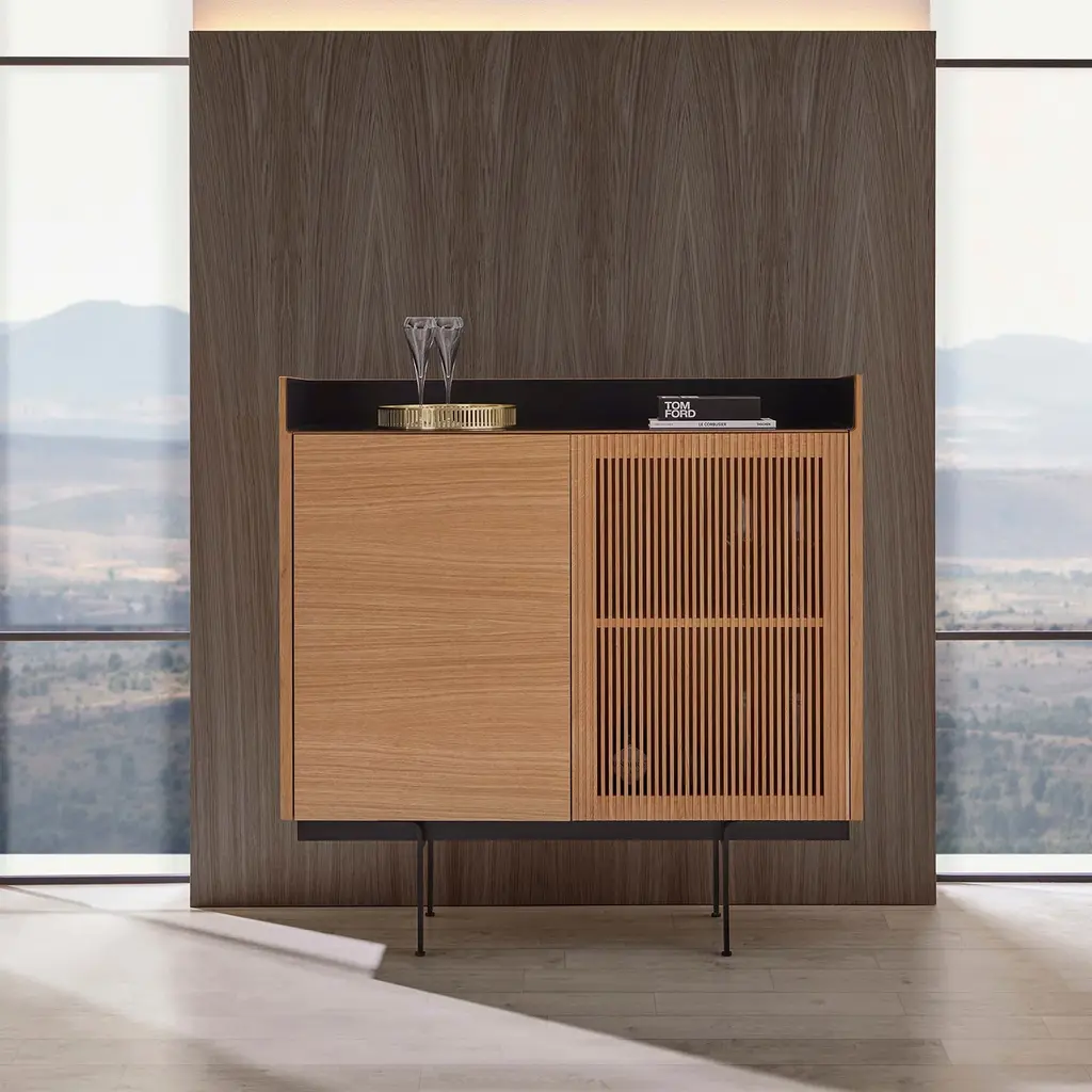 The Stockholm STH225 Cupboard is a distinguished piece from the Red Dot 2015 award-winning Stockholm collection. This cupboard features a unique anodized aluminum top surface, available in finishes such as bronze, gold, black, or chocolate, adding a touch of elegance to its design. Constructed from MDF E1 fiberboard and low-formaldehyde particleboard, it is veneered in natural oak or walnut, offering a choice of finishes to complement diverse interiors. The cupboard includes height-adjustable shelves behind the doors, providing customizable storage solutions. The Stockholm STH225 Cupboard seamlessly blends functionality with sophisticated design.
