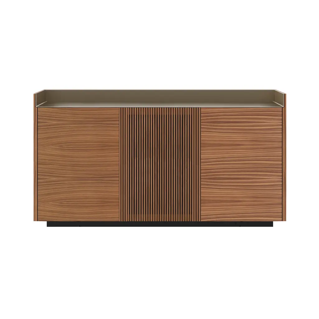 The Stockholm STH334 Cupboard features an anodized aluminum top, adding a unique touch to its design. The structure is crafted from high-quality MDF fiberboard, available in natural oak or walnut veneers. The cupboard includes doors that open to 105 degrees with concealed hinges, providing easy access to the interior, which houses an adjustable shelf for flexible storage solutions. The base is supported by a plinth in black or bronze.