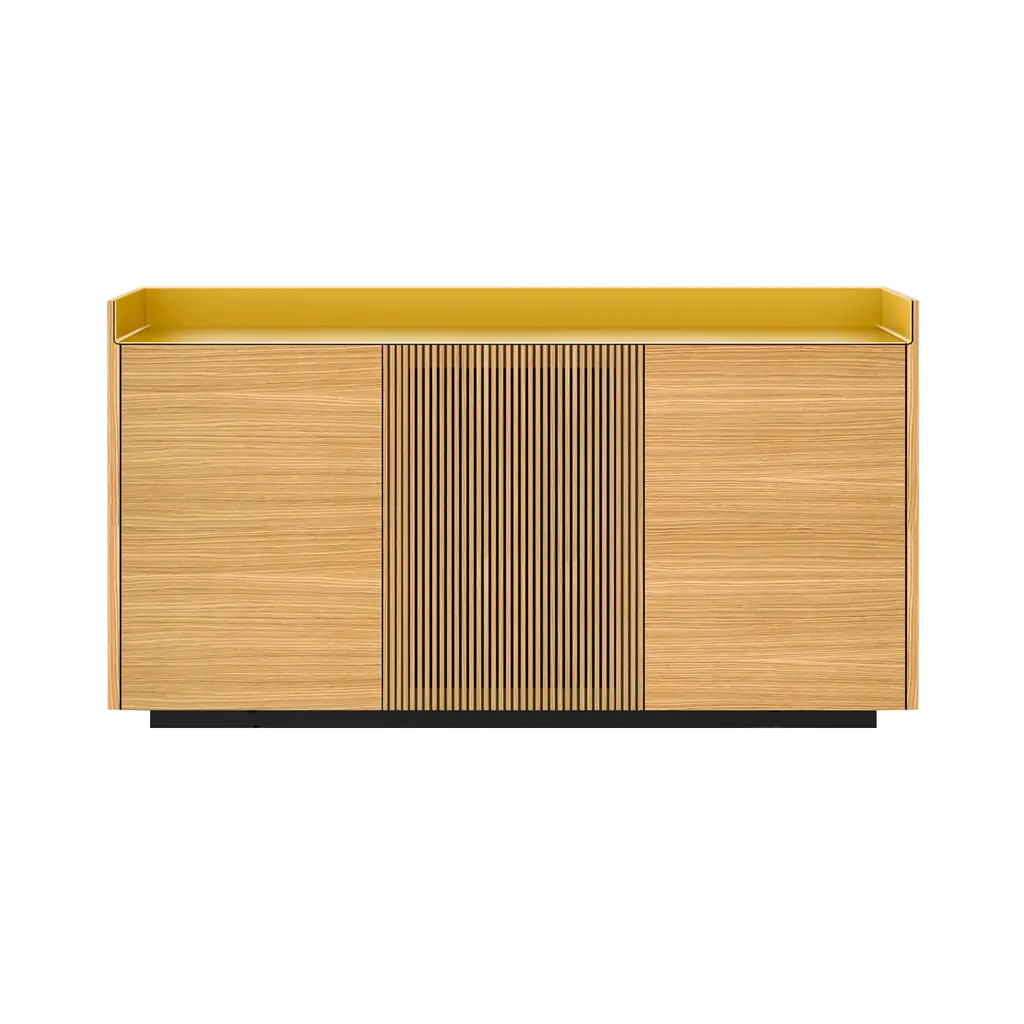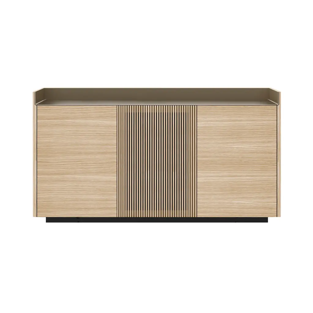 The Stockholm STH334 Cupboard features an anodized aluminum top, adding a unique touch to its design. The structure is crafted from high-quality MDF fiberboard, available in natural oak or walnut veneers. The cupboard includes doors that open to 105 degrees with concealed hinges, providing easy access to the interior, which houses an adjustable shelf for flexible storage solutions. The base is supported by a plinth in black or bronze.