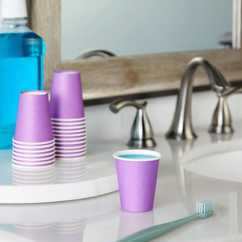Use this set of 600 purple cups to conveniently rinse and gargle mouthwash while you brush your teeth at home, in the office, or while at school. The small bathroom cups each measure 2.2 x 2.35 inches with a 3-ounce capacity and internal coating to ensure liquid does not leak out. Use the small disposable cups for espresso shots or liquor shots too.