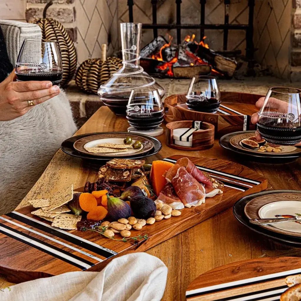 From our Stonewood Stripe Collection - A sublime setting for your next charcuterie spread, this large rectangular serving board is perfect for entertaining. Between layers of rich Acacia Wood are stripes of hand-marbled resin - a juxtaposition of rustic and refined artisanal materials. Each piece is shaped by hand and crafted into unique entertaining pieces. Based in Connecticut, Juliska is committed to bringing elegant European design into our modern homes. Since its founding in 2001, when David and Capucine Gooding began by working with artisans outside of Prague to reproduce antique Bohemian glass pieces, every piece from Juliska has shared a rich heritage spanning six centuries of European design. Juliska's creations are timeless, romantic and effortlessly chic.
