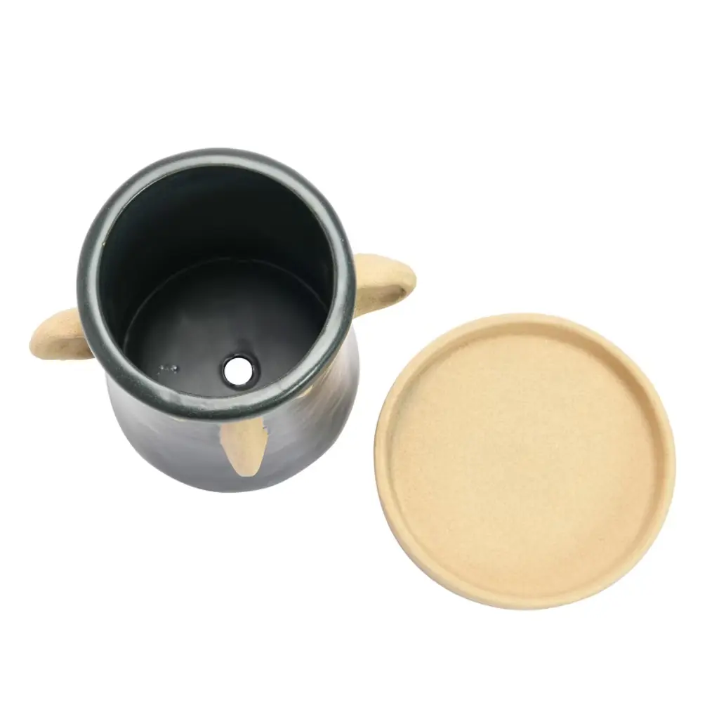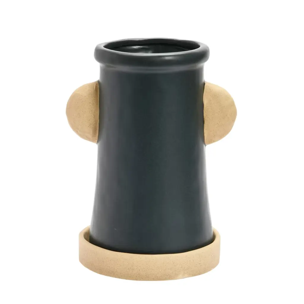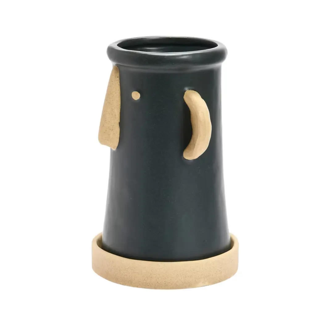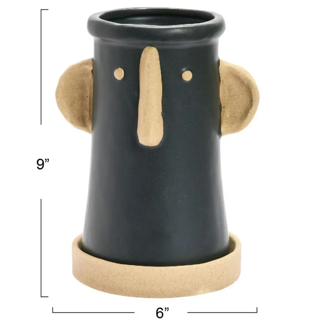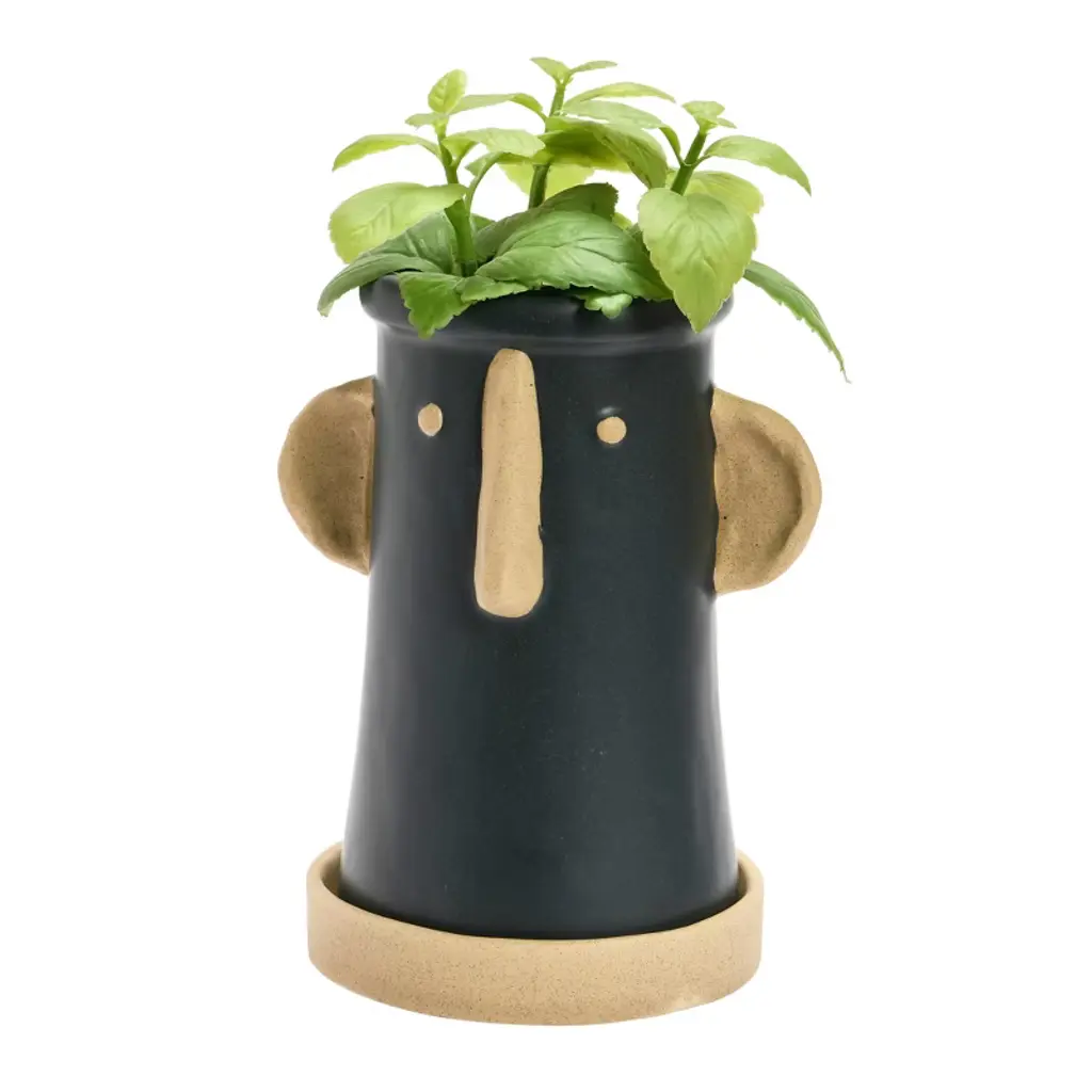 Storied Home Stoneware Face Planter With Saucer, Matte Black And Cream