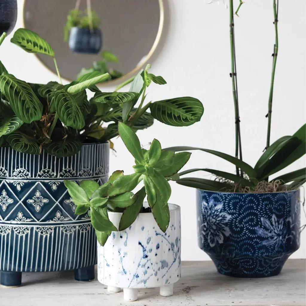 It is a stunning piece of pottery that can brighten up any home. It is made of durable stoneware that has a white base and a blue splatter design that creates a striking contrast and adds some personality to indoor plants. The planter has a round shape and a footed base that gives it some height and stability. The planter has a smooth glazed finish that makes it easy to wipe clean and protects it from scratches and stains. The planter measures 5.75 inches in diameter and 6 inches in height, making it ideal for holding a 5-inch pot or a small to medium-sized plant such as succulents, cacti, ferns, or herbs. The planter is suitable for any style of home décor, whether it is modern, bohemian, or eclectic. It can add some color and texture to the living room, bedroom, kitchen, or office. The Splatter Stoneware Planter, White and Blue is a great way to display plants and show off artistic taste.