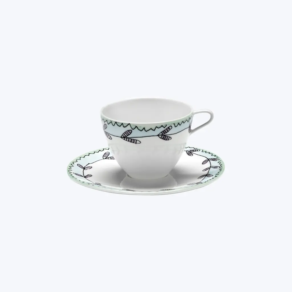 This set of two coffee cups and saucers is a testament to the craftsmanship and timeless quality of Geminiano Cozzi's designs. This porcelain set boasts a white background hand-painted with a radial motif of green stripes framed by thin gold brushstrokes. The resulting sophisticated effect will elevate a cozy afternoon tea with friends into a luxurious experience. The cup (110 ml) has a streamlined shape with a fluted mouth and long handle, while the saucer (12 Ø cm) has a delicate hand-painted green branch in the center. Comes in a signature gift box. Made to order, allow 4-6 weeks.