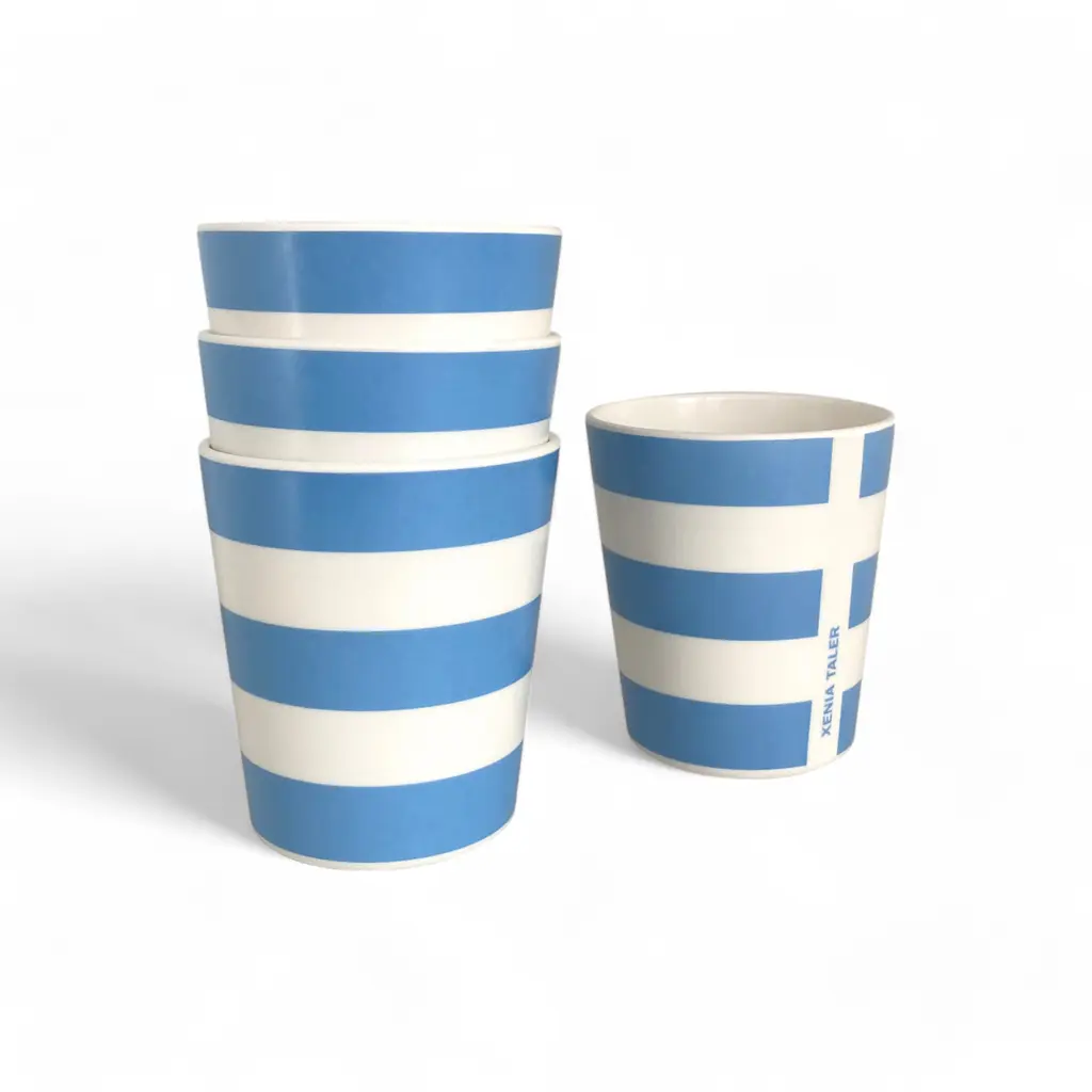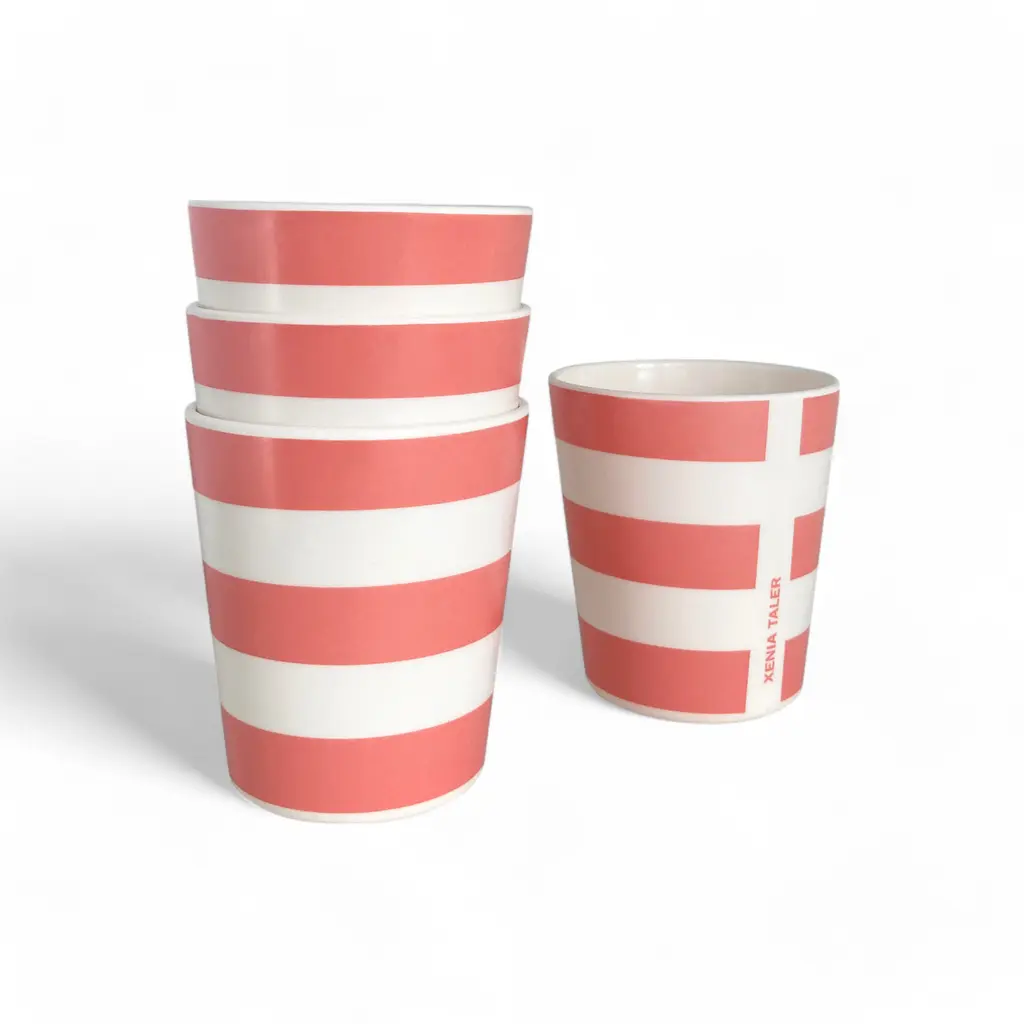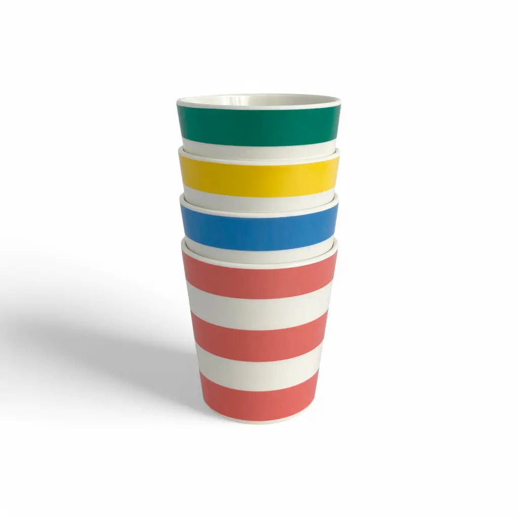 Bring more color into your life with these striped cups from the Xenia Taler collection. Featuring a striped pattern in vibrant colors, these cups make any drink more appealing, whether it’s a hot coffee enjoyed by the campfire or fresh juice on a summer day in the park. As practical as they are eye-catching, these striped cups are made from bamboo and melamine. The material is non-shattering and tough as well as lightweight, resistant to daily wear, and safe to clean in the dishwasher. Plus, the cups stack to occupy less space on a shelf in a cupboard or in a picnic bag. Complement these cups with the matching bowls from the same collection. Please keep in mind that the Xenia Taler collection of bamboo tableware is made with a resin binder and is NOT microwave-safe.