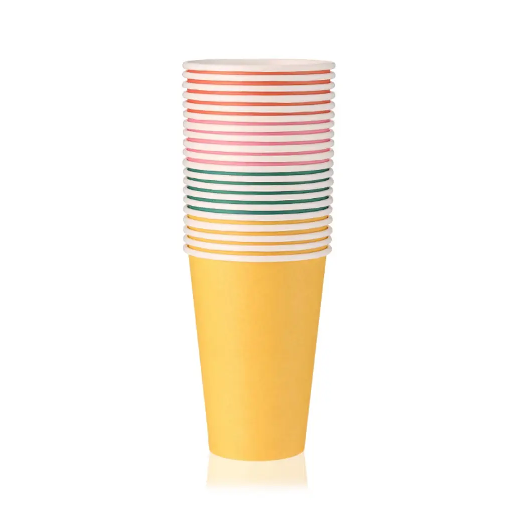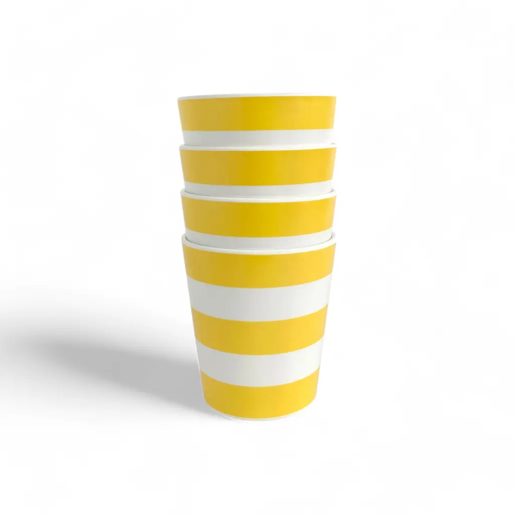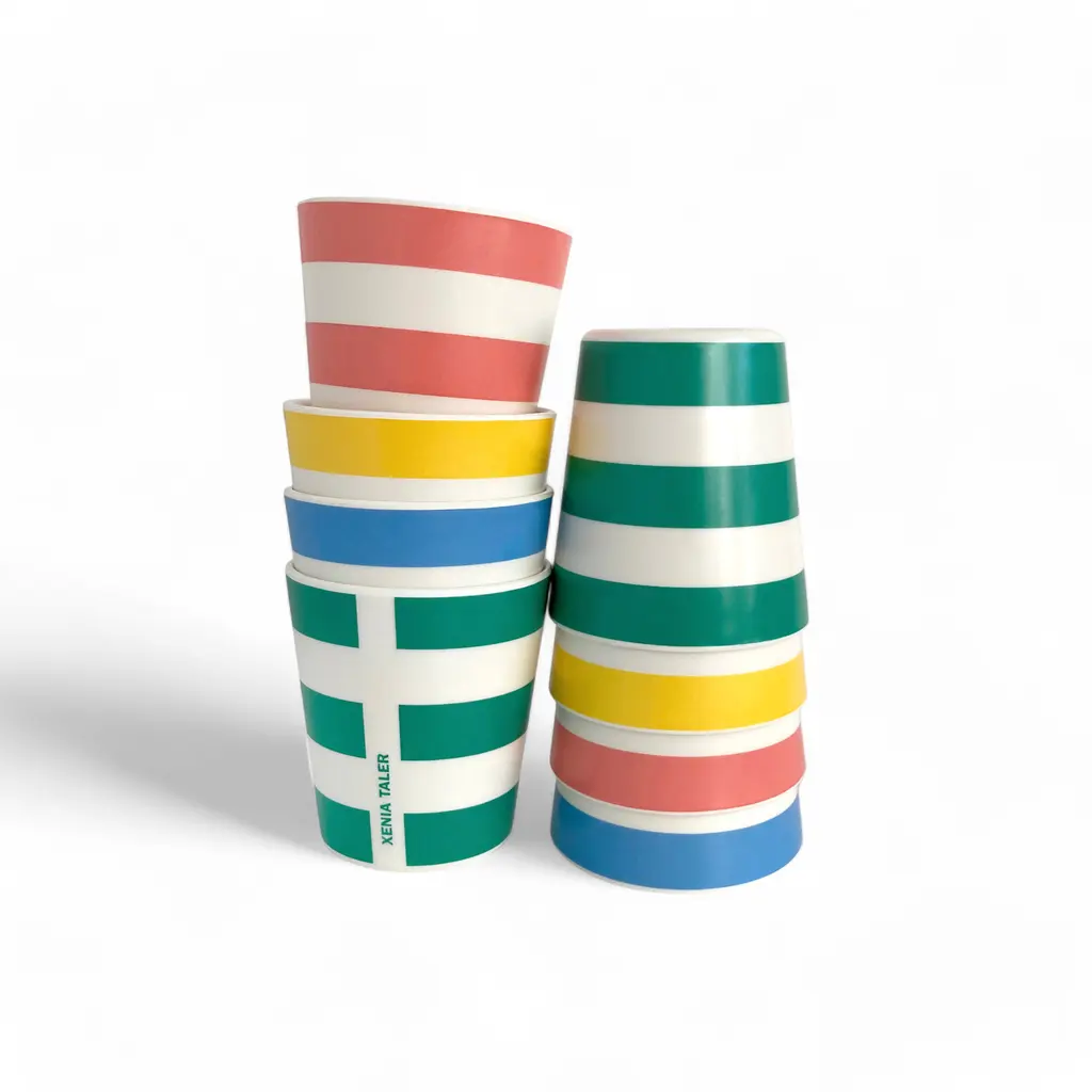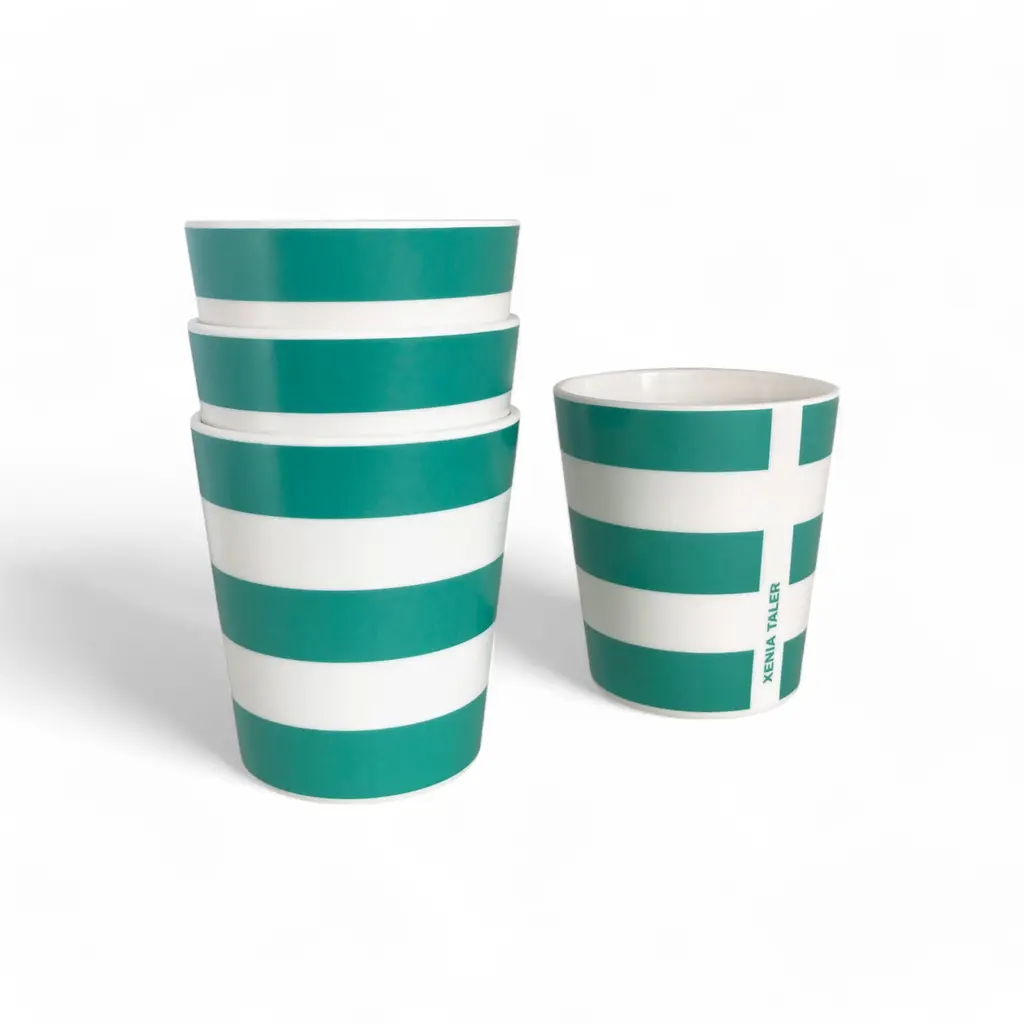 Bring more color into your life with these striped cups from the Xenia Taler collection. Featuring a striped pattern in vibrant colors, these cups make any drink more appealing, whether it’s a hot coffee enjoyed by the campfire or fresh juice on a summer day in the park. As practical as they are eye-catching, these striped cups are made from bamboo and melamine. The material is non-shattering and tough as well as lightweight, resistant to daily wear, and safe to clean in the dishwasher. Plus, the cups stack to occupy less space on a shelf in a cupboard or in a picnic bag. Complement these cups with the matching bowls from the same collection. Please keep in mind that the Xenia Taler collection of bamboo tableware is made with a resin binder and is NOT microwave-safe.