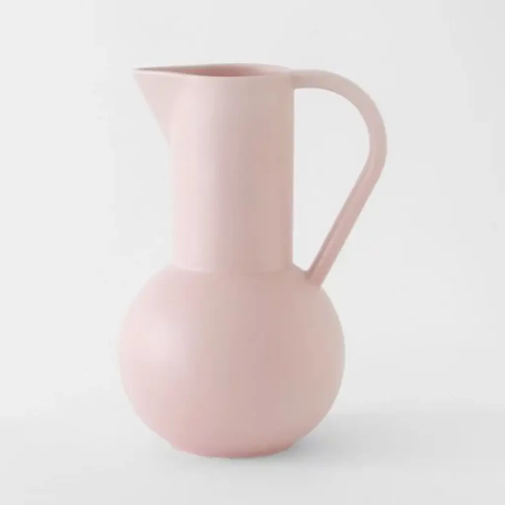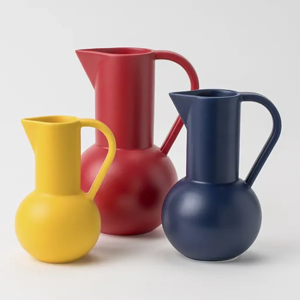 The Strom Jug from Raawii presents clean construction and contemporary form, surfaced with rich coloring. A Nicholai Wiig-Hansen design made in Portugal by artisan hands, its glaze is personally applied, while its rounded base and cylinder body show off simple geometric shapes. The material is rated for food safety and can hold beverages or plants for display, while unique variations and imperfections help each piece stand out as its own unique construction.