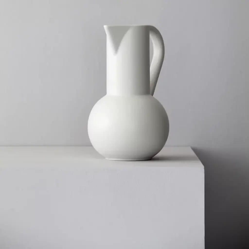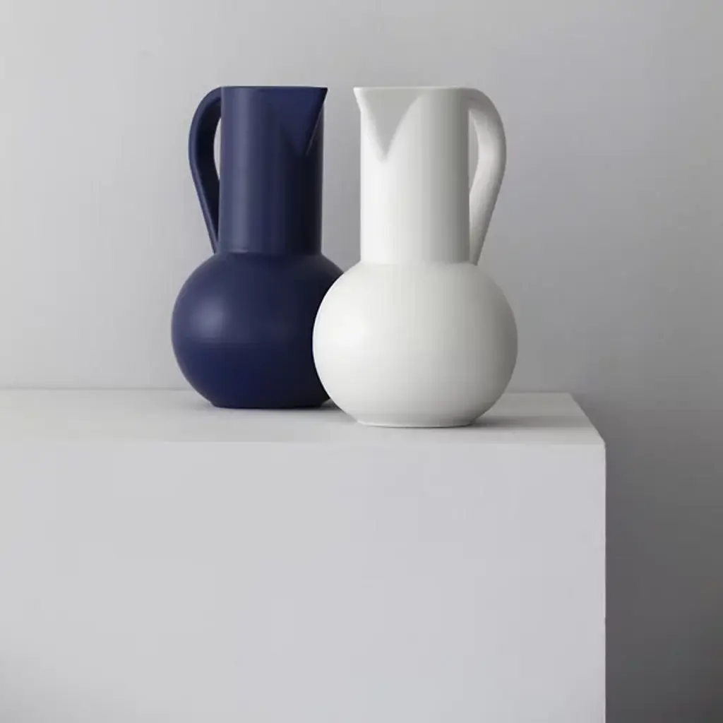 The Strom Jug from Raawii presents clean construction and contemporary form, surfaced with rich coloring. A Nicholai Wiig-Hansen design made in Portugal by artisan hands, its glaze is personally applied, while its rounded base and cylinder body show off simple geometric shapes. The material is rated for food safety and can hold beverages or plants for display, while unique variations and imperfections help each piece stand out as its own unique construction.