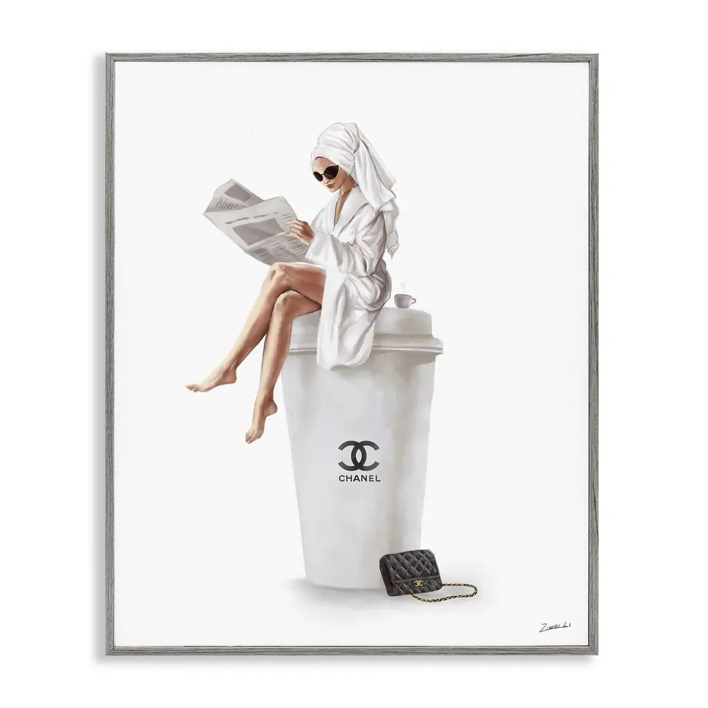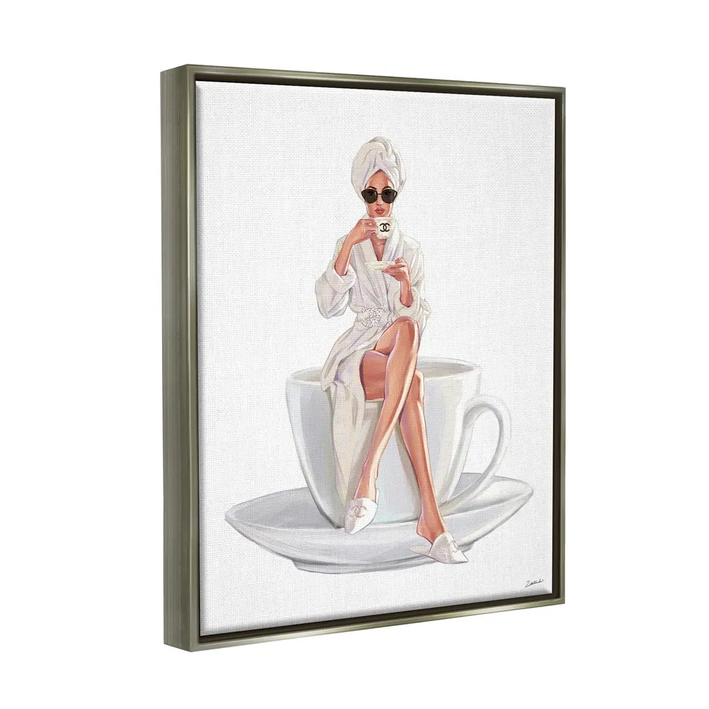 Stupell Chic Woman Robe Coffee Cup Designer Logo Sunglasses Floater Frame - White - 16 X 20 - Grey