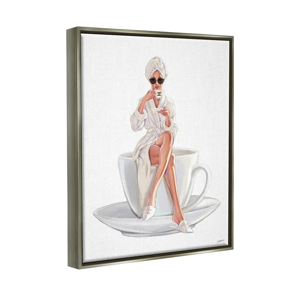 Stupell Chic Woman Robe Coffee Cup Designer Logo Sunglasses Floater Frame - White - 24 X 30 - Grey
