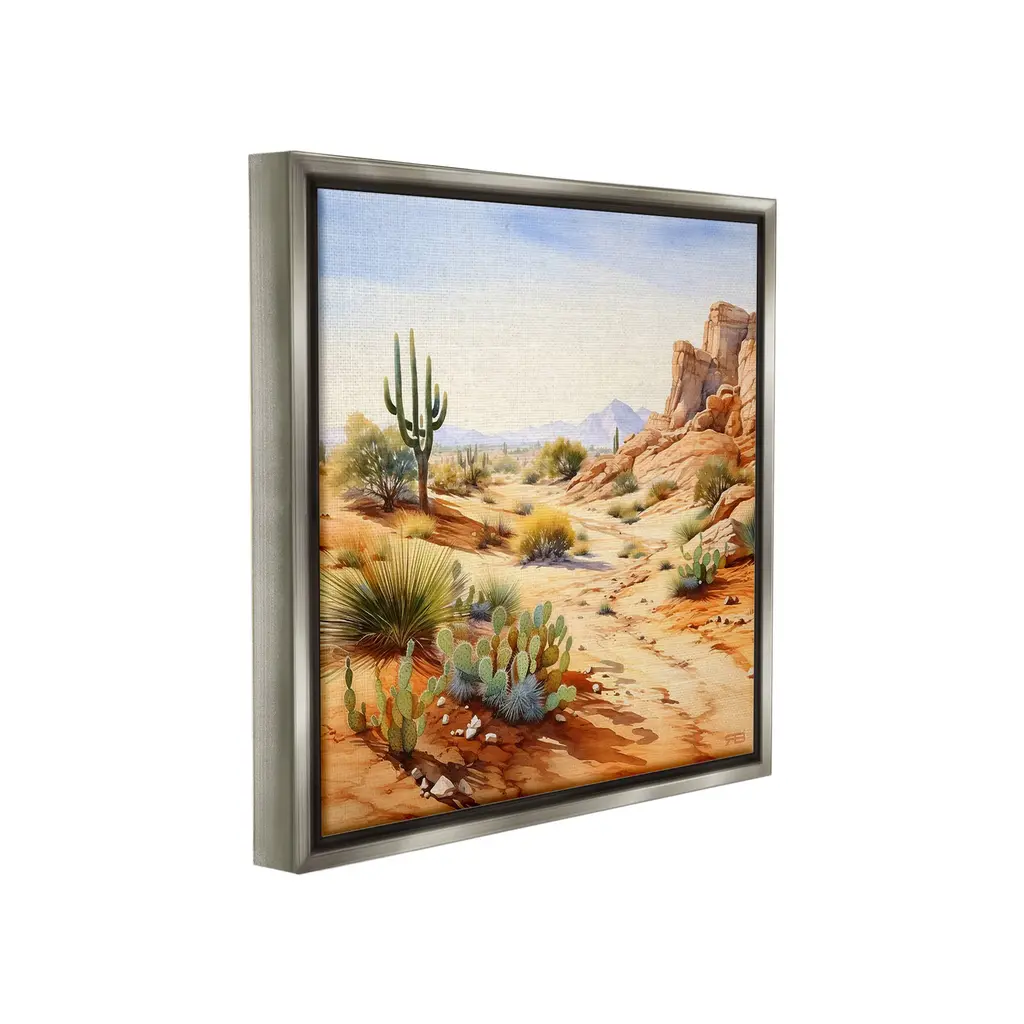 Elevate your home or office to the next level with Stupell Framed Floating Canvas Wall Art. Our premium hand-stretched canvas is mounted securely into a sturdy lightweight frame. The museum-style gap between the wrapped canvas and the box frame gives the illusion of floating artwork. Stupell Wall Art is made in the USA.Features: Dimensions: 18 x 1.7 x 18 Frame, 17 x 1.5 x 17 Canvas ArtFloating Frame Canvas Products are available in sizes 18"x18" and 25"x25". All Floating Frame Canvas Products have a 1.7" Depth.Wall Art is Ready to Hang with Hardware Free Hanging. No Installation required. For Easy Set Up Lean or Layer Artwork on Shelf or Against Wall. Artwork is Permently Fixed into the Frame.Our elevated 1.7" Thick Floating Frame is the perfect complement to our canvas style Wall Art. We use only the highest quality inks in house with industry leading printing solutions. Canvas is hand stretched over a durable wood foundation and then mounted securly into a Modern Box Frame. Made in the USA.Artwork Relates To: Road, Nature, Sky, Scenery, Landscape, Desert, Cactus, Mountain, Vegetation, Botanical, Plant, Canyon, PlateauDesign by RB