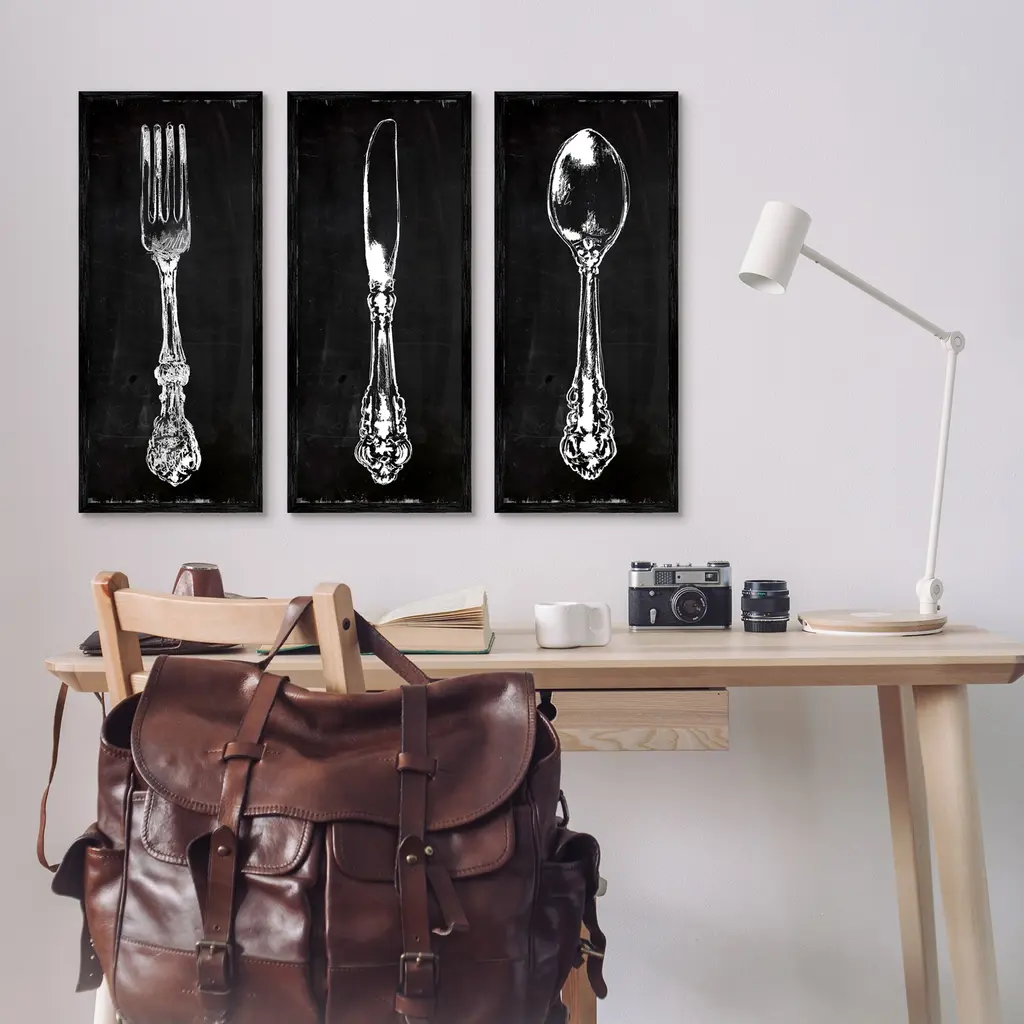 Fill any space in your home or office with our Framed Wall Art Sets. Our textured artwork will add more depth and dimension to any space. Each piece is mounted into a 1.5 inch thick ebony wood grain frame that is ready to hang. Looking for a statement piece? Our boxed framed products are now available in three alluring styles: black, gray farmhouse and white. We have oversized artwork available.Features: Wall Art is Ready to Hang - No Installation or Hardware Needed. For Easy Set Up Lean or Layer Artwork on Shelf or Against Wall.Curated Wall Art Sets make it easy for you complete the theme for any room. Our giclee prints are carefully mounted on a durable MDF backing, and then perfectly finished in a 1.5 inch thick woodgrain frame. Mounted frame colors include black, gray farmhouse and white. Made In USA.Artwork Relates To: Cutlery; Fork; Spoon; Design by Carol Robinson